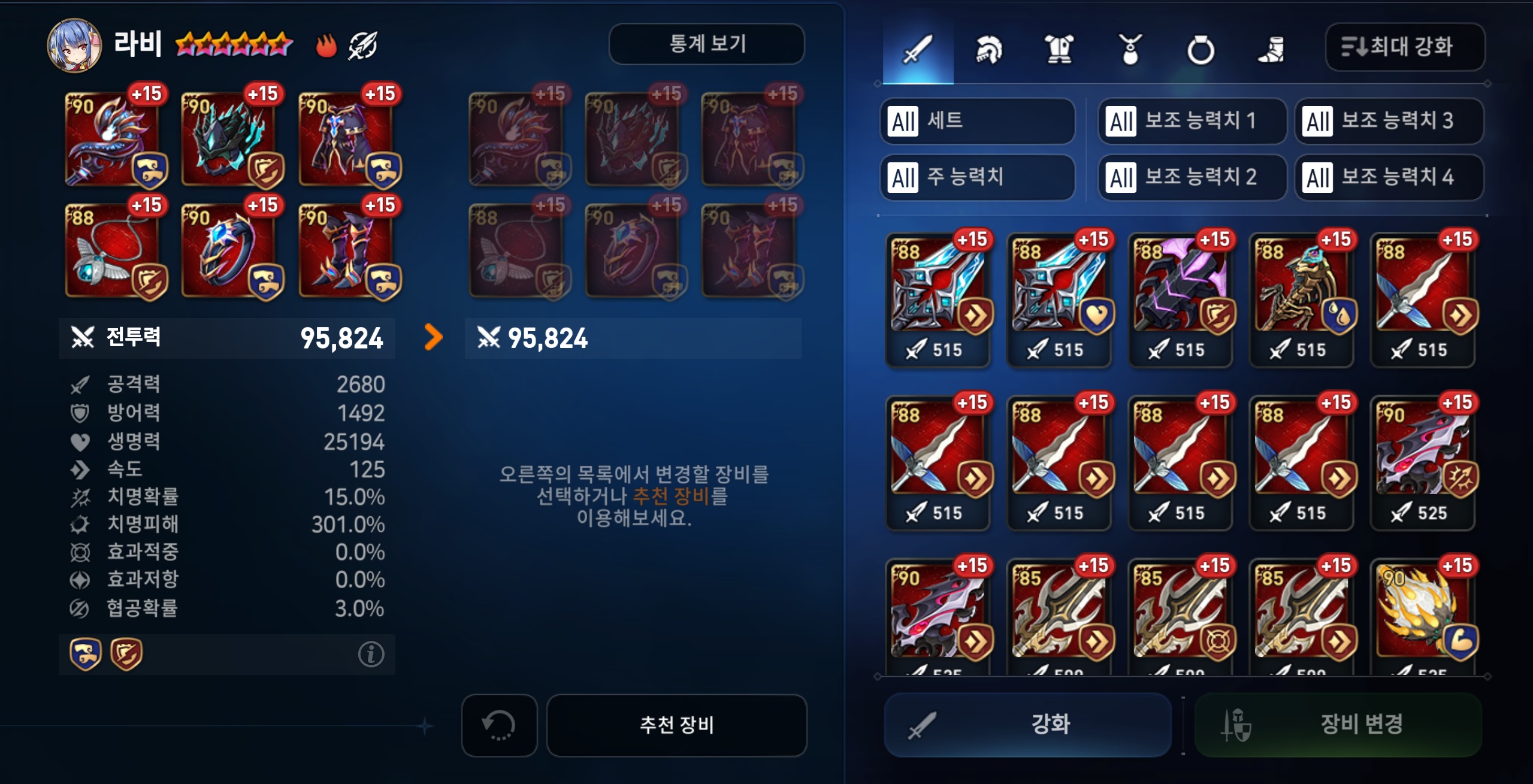 - 현재 장착 중이지 않은 +15 강화 장비 장착 추천 영웅을 안내해주는 [장비 장착 추천] 기능이 추가됩니다.