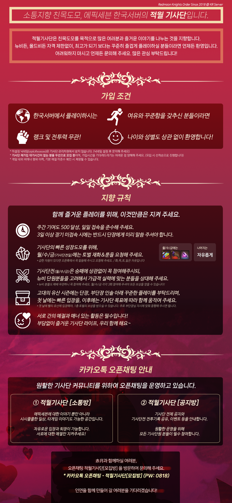 글상세기사단 모집 [한국]"赤月"(적월) 기사단원 모집 (28/30) (모집완료) Rank 70 민물낚시[민물낚시] 2025-12-21 11:58 2025-12-21 20:58 (+09:00) view count 23 MY홈 보기 작성글 보기 신고하기 공유하기 기사단전쟁 승패 상관없이 꾸준히 참여하시는 분고대의 유산 협조적으로 참여하시는 분임무 및 기여도 적극 참여하시는 분기본 닉네임 아니신 분모집 합니다 댓글 0 alarm 알림이 해제되었습니다. 최신순 최신순 등록순 추천순 댓글을 입력하려면 로그인 해주세요. 확인 취소 확인
