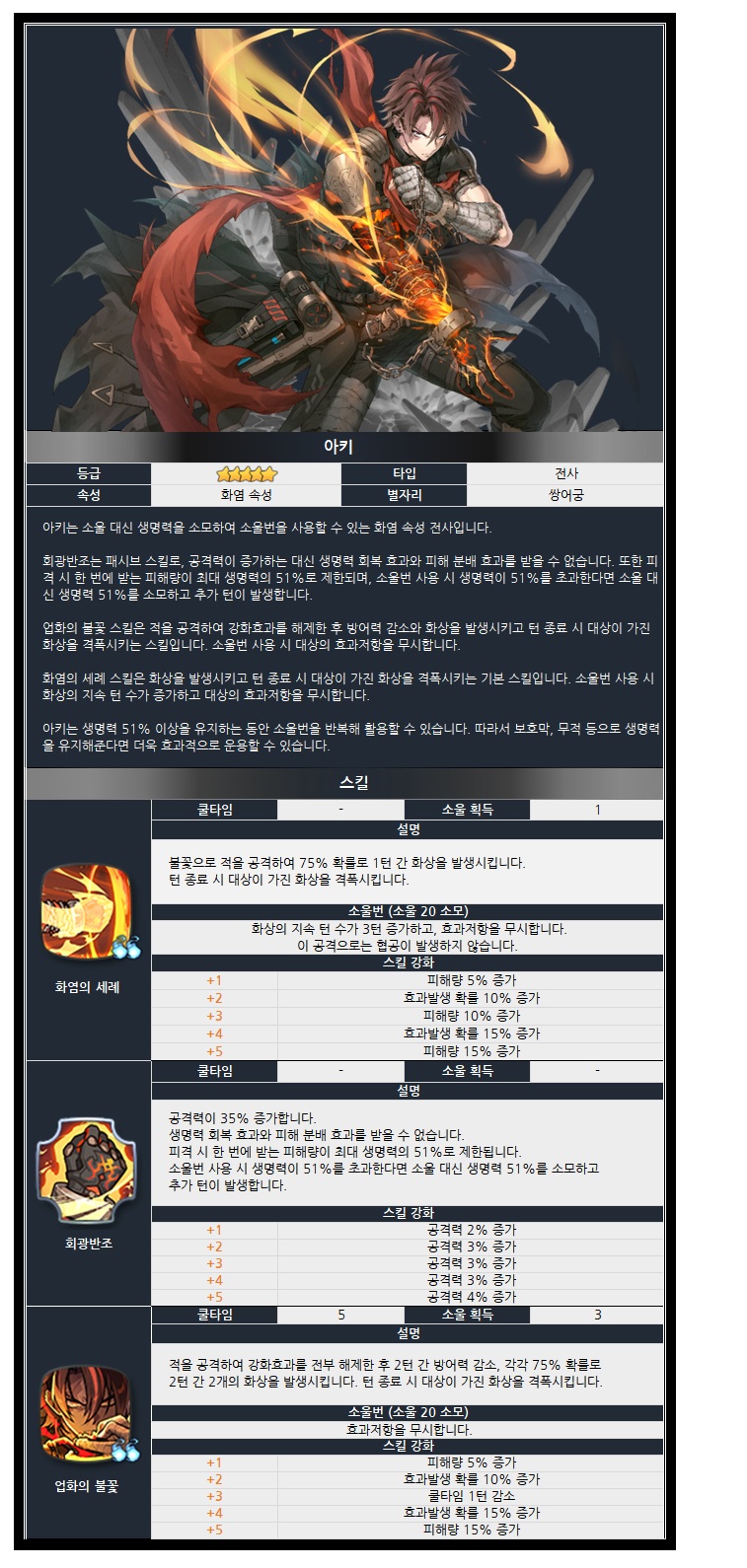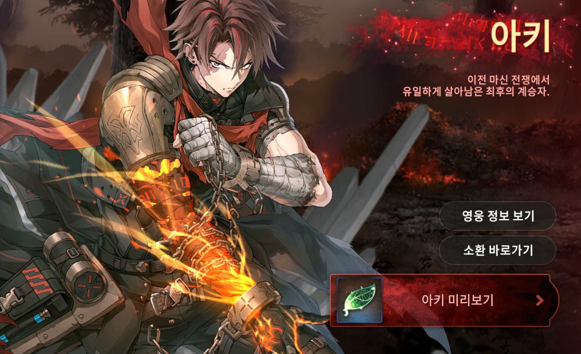 소울 대신 생명력을 소모하여 소울번을 사용할 수 있는 화염 속성 전사 ‘아키’와 효과저항이 증가하고 전투 시작 시 공격력에 비례한 보호막을 발생시키는 전사 전용 아티팩트 ‘봉염의 의식’을을 소환 확률 UP! 에서 만나보세요!