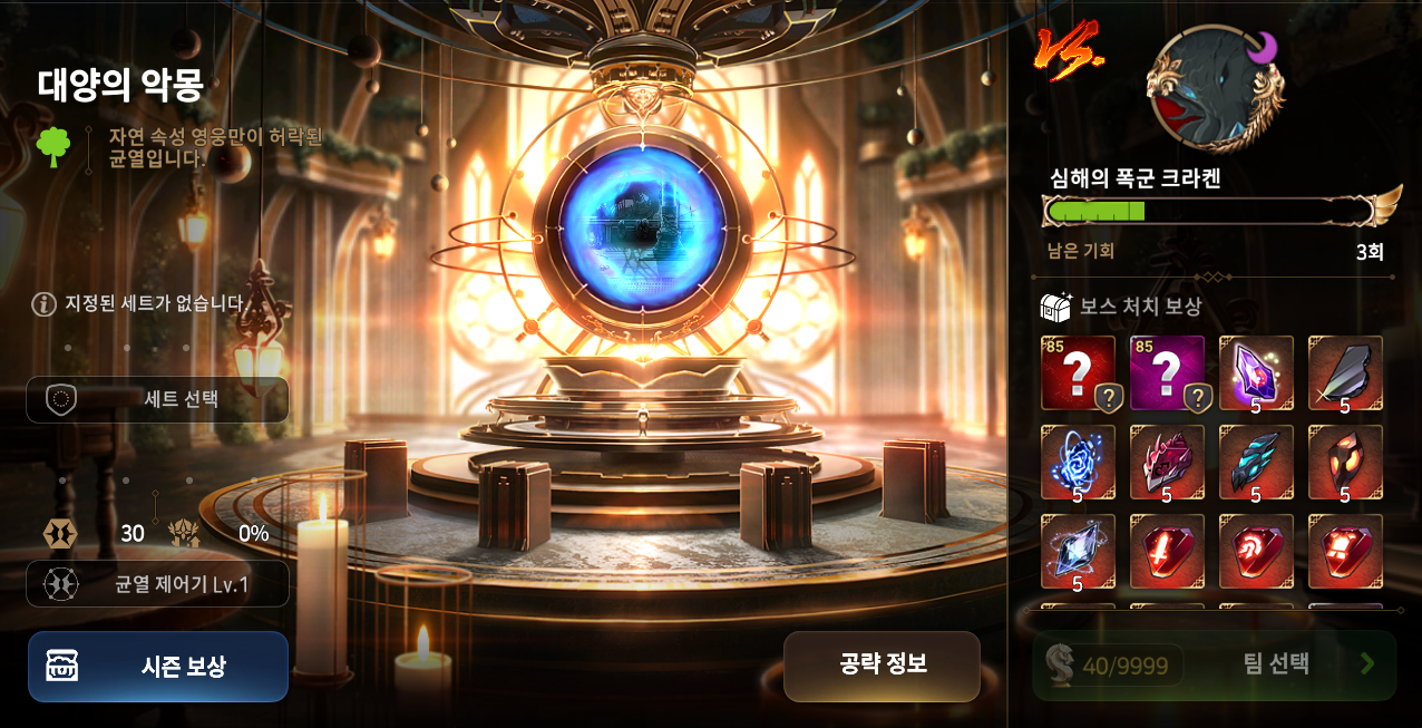 - 세트를 선택하지 않으면 균열 전투를 진행할 수 없습니다.