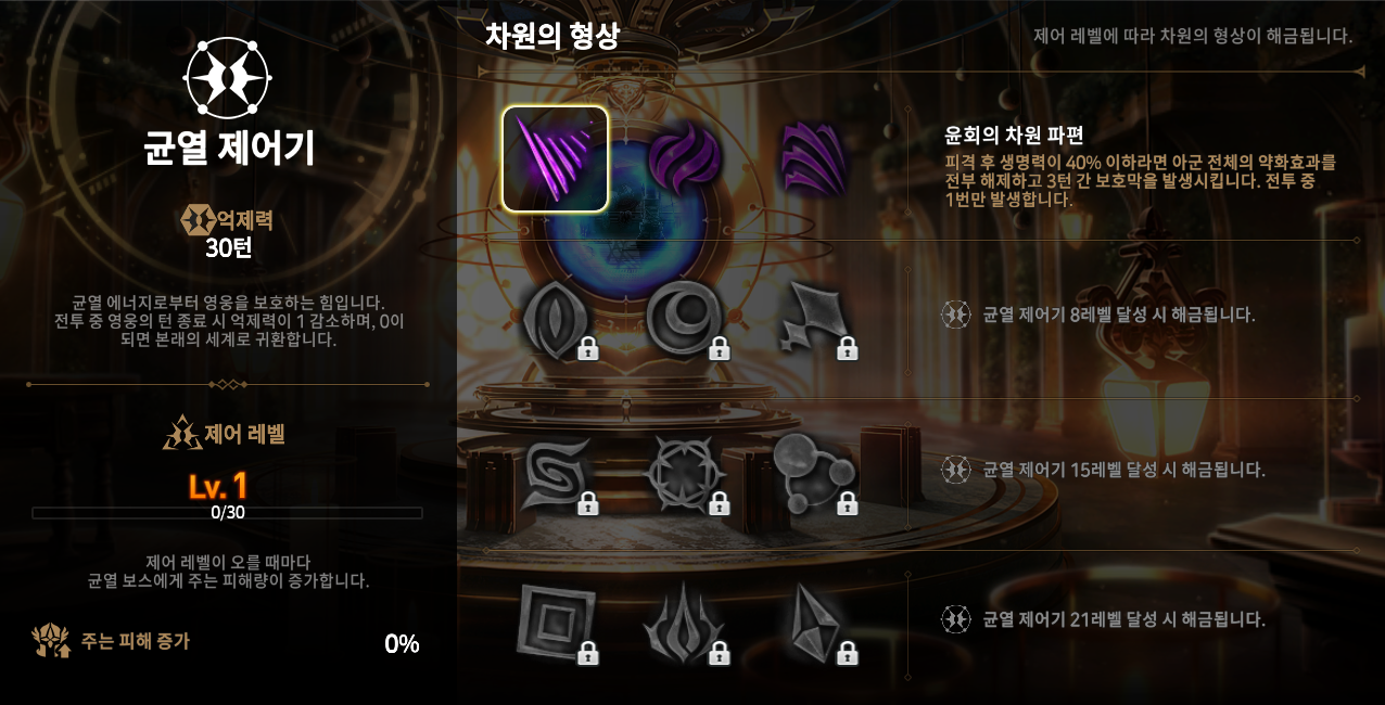 - 제어 레벨이 증가할 때마다 균열 보스에게 주는 피해량이 증가합니다.