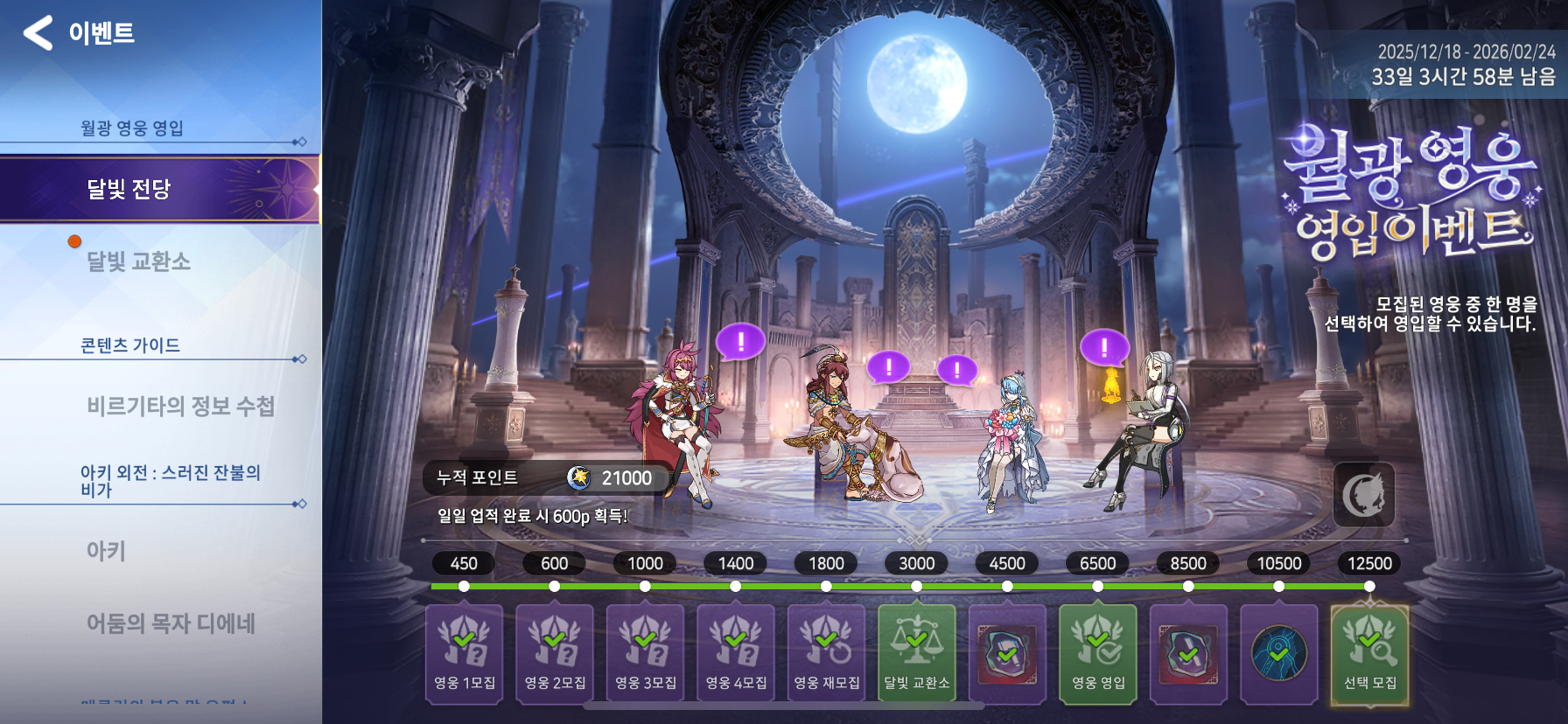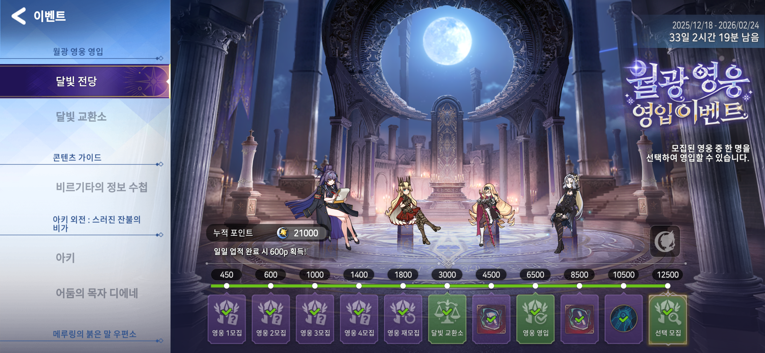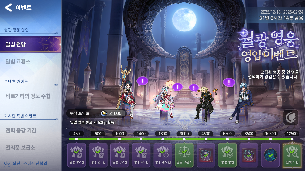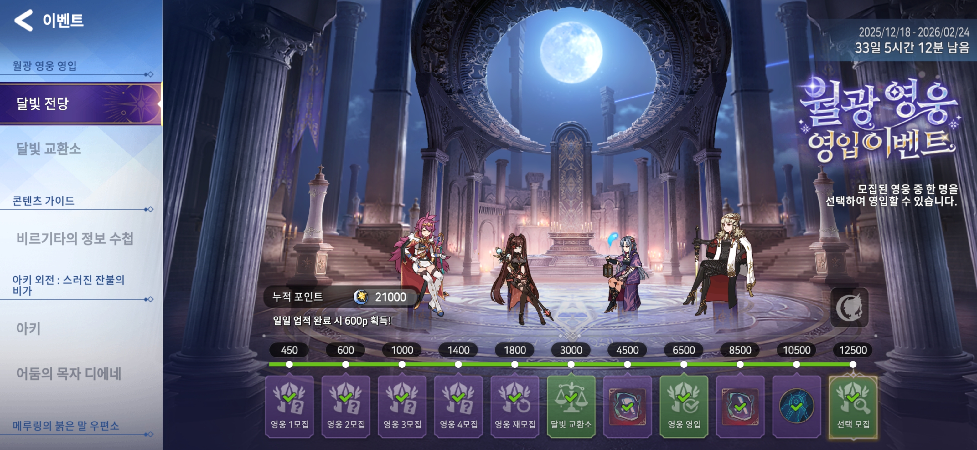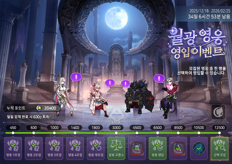 특히나 이번 이벤트는 영입 대상의 영웅들이 달빛 전당’에 모여 앉아 마치 또 다른 로비처럼 보여요!