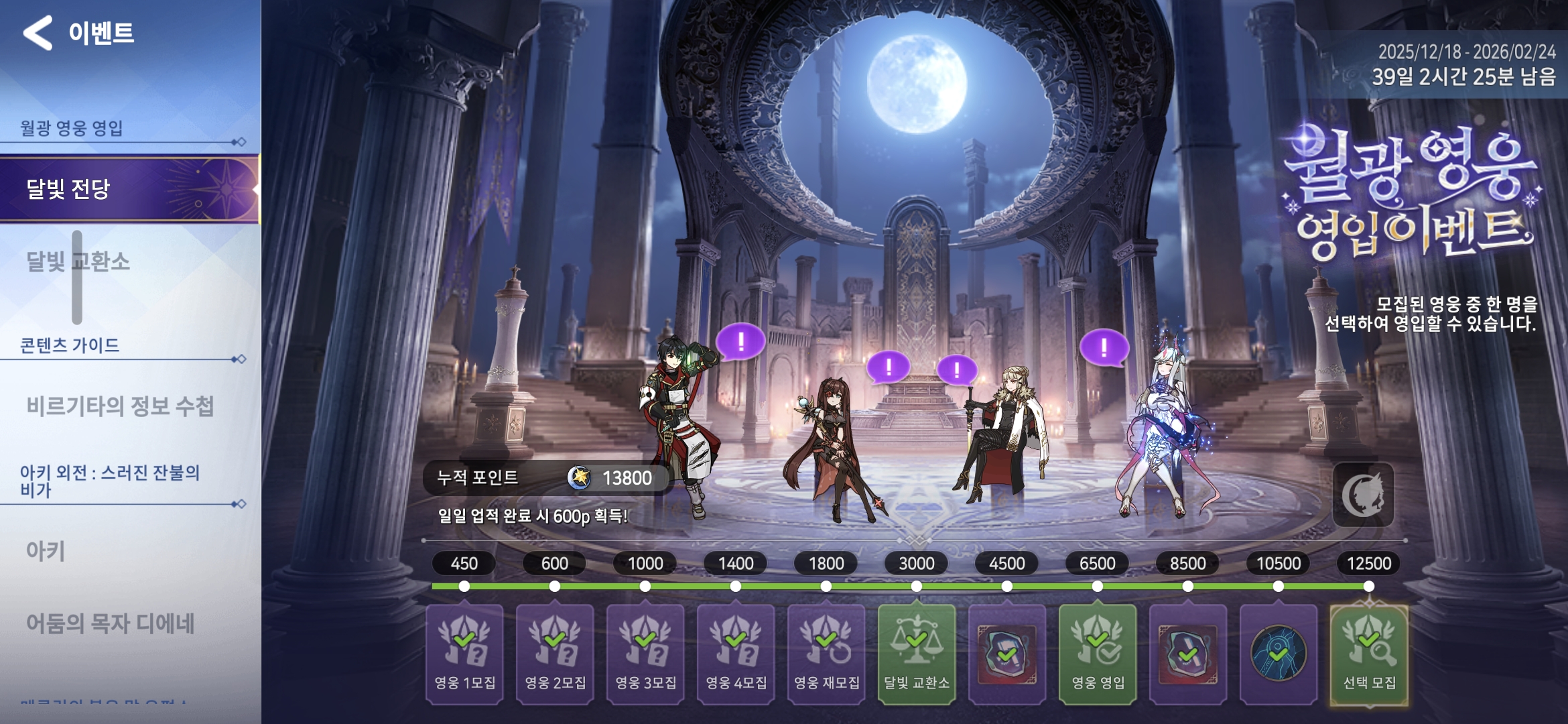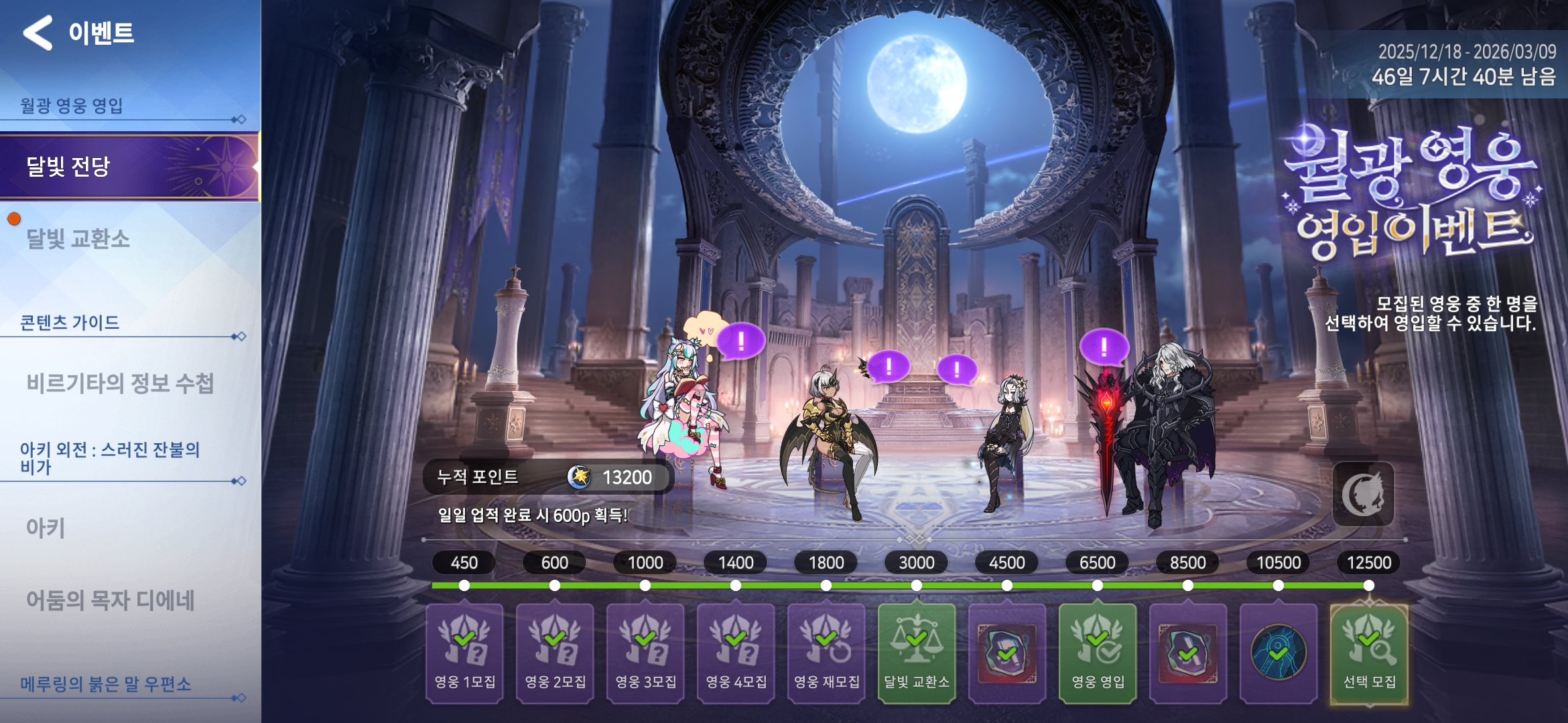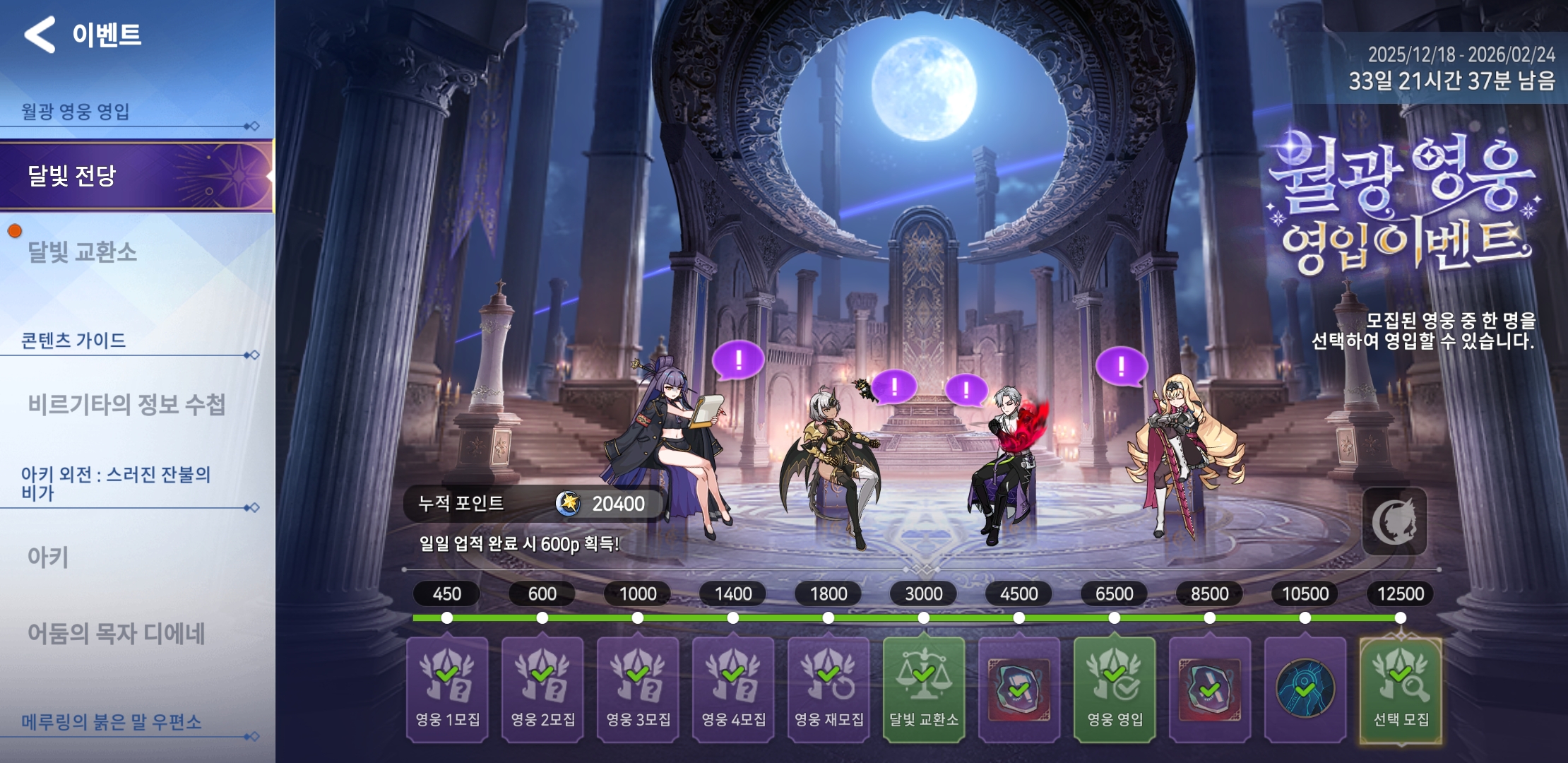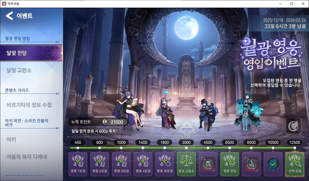 특히나 이번 이벤트는 영입 대상의 영웅들이 달빛 전당’에 모여 앉아 마치 또 다른 로비처럼 보여요!