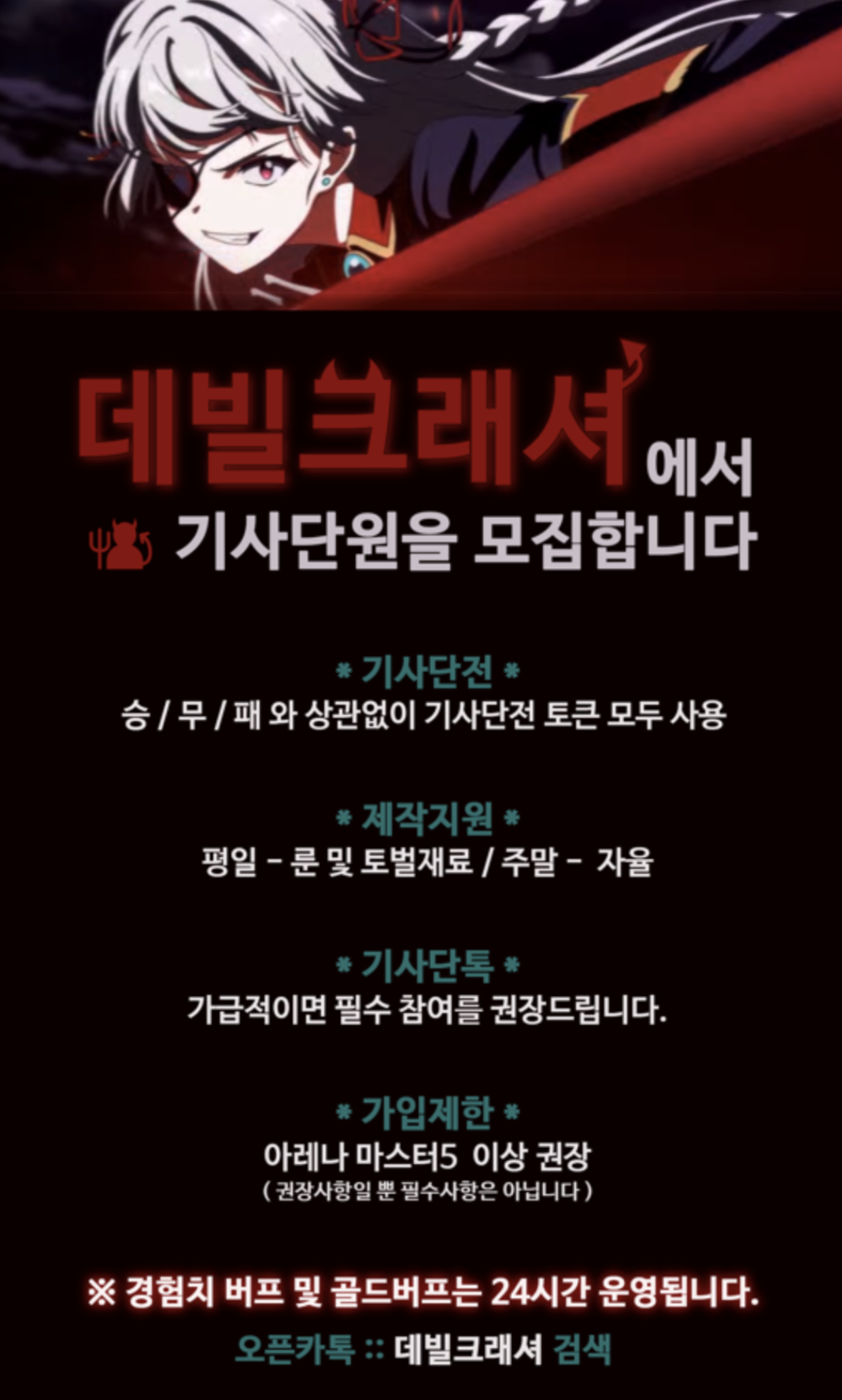 한섭 ☀️20Lv 뉴비 복귀 환영, ☀️☆데빌크래셔☆ 단원 6명 모집 기사단전 방덱구성 가능하신 분