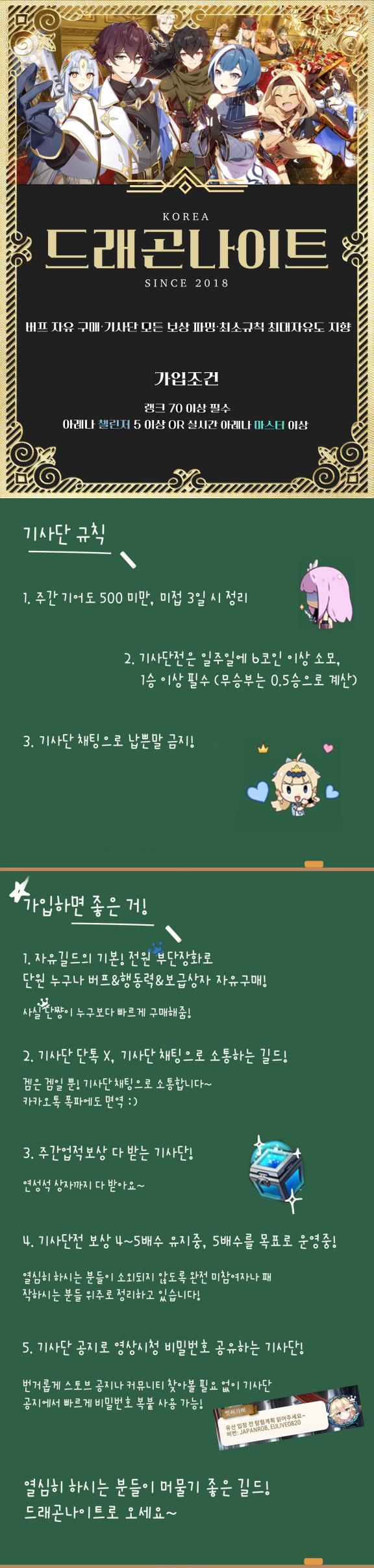 글상세기사단 모집 ✿ 드래곤나이트에서 기사단원을 모집합니다 ✿ (27/30) ✿ [2] Rank 70 Skrr[9케페우스] 2026-02-02 09:54 2026-02-02 18:54 (+09:00) view count 12 MY홈 보기 작성글 보기 신고하기 공유하기 가입조건 Lv.20드래곤나이트 서버 한국 단원 수 27/30 랭크 제한 70 가입 유형 공개(선별가입) 소개 [유산 및 주간보상올클] [주간기여도 500미만or3일 미접 out] [단전 열심히! 납쁜말 금지!] 열심히 하실 분, 같이 즐겜하실 분 상시 모집! 많관부~~ 댓글 2 alarm 알림이 해제되었습니다. 최신순 최신순 등록순 추천순 댓글을 입력하려면 로그인 해주세요. 삣삐까삐[삣삐까삐] 2026-02-03 00:50 2026-02-03 09:50 (-NaN:NaN) MY홈 보기 작성글 보기 신고하기 많관부~ Skrr[9케페우스] 작성자 2026-02-03 04:34 2026-02-03 13:34 (+09:00) MY홈 보기 작성글 보기 신고하기 확인 취소 확인