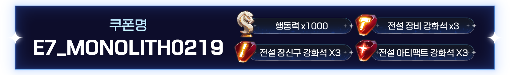 1> 쿠폰 번호 : E7_MONOLITH0219