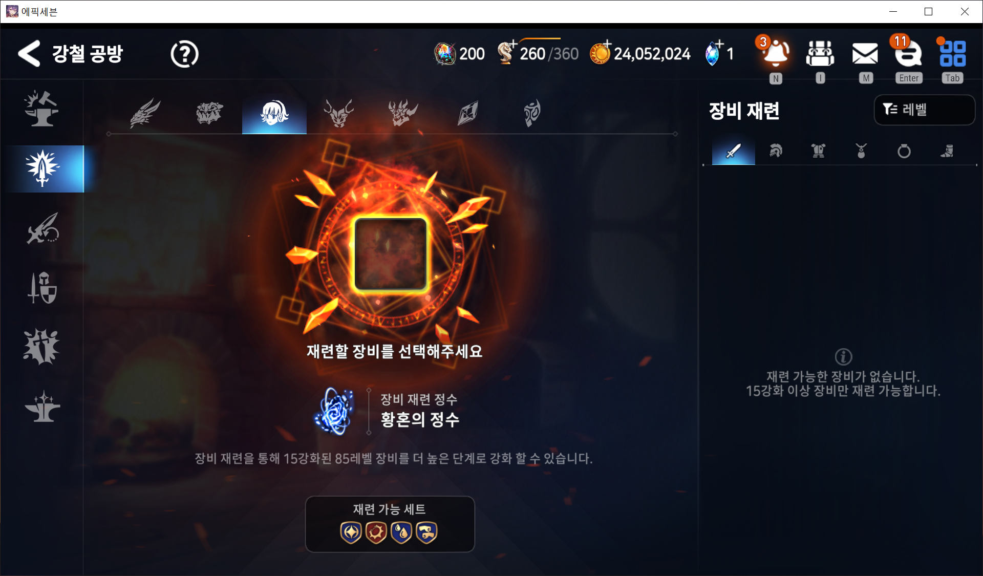 위 계승자님의 도움말처럼 [심연]에서 획득한 "가벨리트의~"로 시작하는 장비는 재련이 불가능합니다.
