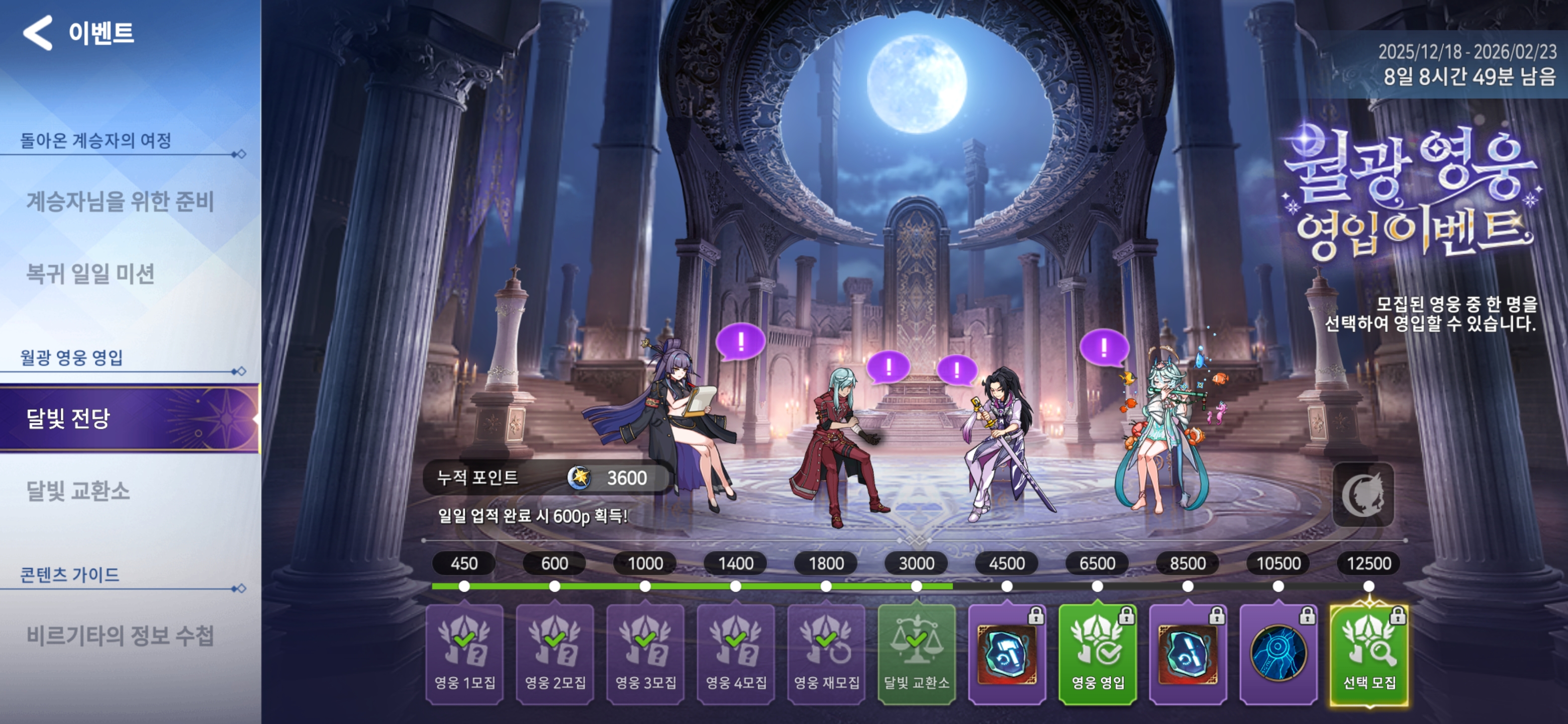 아슬아슬하실듯.. 누적 6500부터 현재 리스트 중에서 데려올 수 있고, 데려올 때 포인트가 1800? 3000? 정도 들거에요. 포인트는 매일 일퀘할 때마다 600씩 획득.
