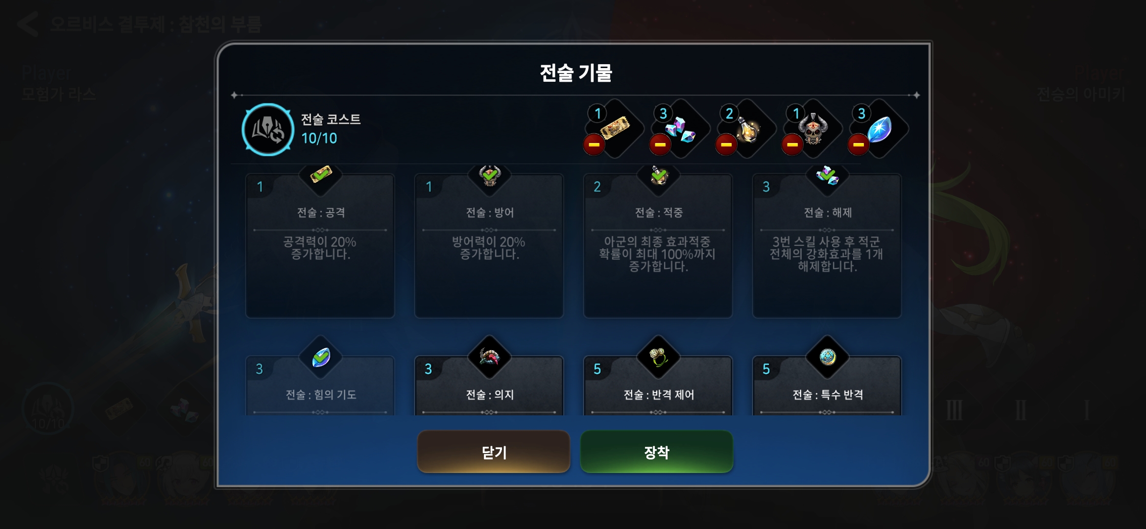 전술기물 : 방어, 힘의 기도, 앙상블, 진심 기본 공격, 일점 집중