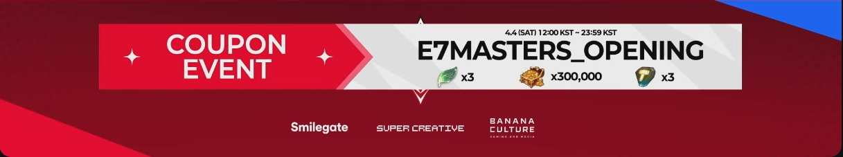 글상세자유 게시판 E7 Masters 2026 조편성 공개 & 쿠폰 [7] Rank 71 리코타엘마르[리코타엘마르] 2026-04-04 02:30 2026-04-04 11:30 (+09:00) view count 939 MY홈 보기 작성글 보기 신고하기 공유하기 배너표시가 안뜨는경우 : https://epic7.onstove.com/ko/coupon쿠폰번호 : WELCOMEGIFT_BYBLISE7MASTERS_OPENING 댓글 7 alarm 알림이 해제되었습니다. 최신순 최신순 등록순 추천순 댓글을 입력하려면 로그인 해주세요. epic7#hke01m[S1758440011247311] 2026-04-04 18:31 2026-04-05 03:31 (+09:00) MY홈 보기 작성글 보기 신고하기 E7MASTERS_OPENING이거는 안 되네요 이모티콘 하나만 주고...쫌팽이 같네 리코타엘마르[리코타엘마르] 작성자 2026-04-05 08:33 2026-04-05 17:33 (+09:00) MY홈 보기 작성글 보기 신고하기 해당쿠폰 배너를 보면 쿠폰코드 위에 "4.4 (SAT) 12:00 KST ~ 23:59 KST"라고 쓰여있네요. 프리에타[No2357] 2026-04-04 13:35 2026-04-04 22:35 (+09:00) MY홈 보기 작성글 보기 신고하기 리코타엘마르[리코타엘마르] 작성자 2026-04-05 08:31 2026-04-05 17:31 (+09:00) MY홈 보기 작성글 보기 신고하기 커피[C0FFEE] 2026-04-04 04:31 2026-04-04 13:31 (+09:00) MY홈 보기 작성글 보기 신고하기 리시아[리시아1] 2026-04-04 03:30 2026-04-04 12:30 (+09:00) MY홈 보기 작성글 보기 신고하기 리코타엘마르[리코타엘마르] 작성자 2026-04-04 04:14 2026-04-04 13:14 (+09:00) MY홈 보기 작성글 보기 신고하기 확인 취소 확인