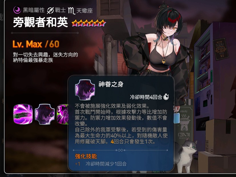 我是強烈建議把不會被施展強化和弱化效果取消或是改成部份弱化效果(例如:睡眠)不會被施展也行,目前的任何弱化效果都免疫真的過份了,除了硬打把她打死否則真的沒解法(要暈她不行、要封印她也不行…),問題是這隻角色很多玩家都是給她穿反擊套+席格勒賽斯神器,因此有機率反擊和回血導致很難處理,然後打她隊友萬一隊友受到傷害為最大生命力40%又會隨機給我方任一角色三技能且