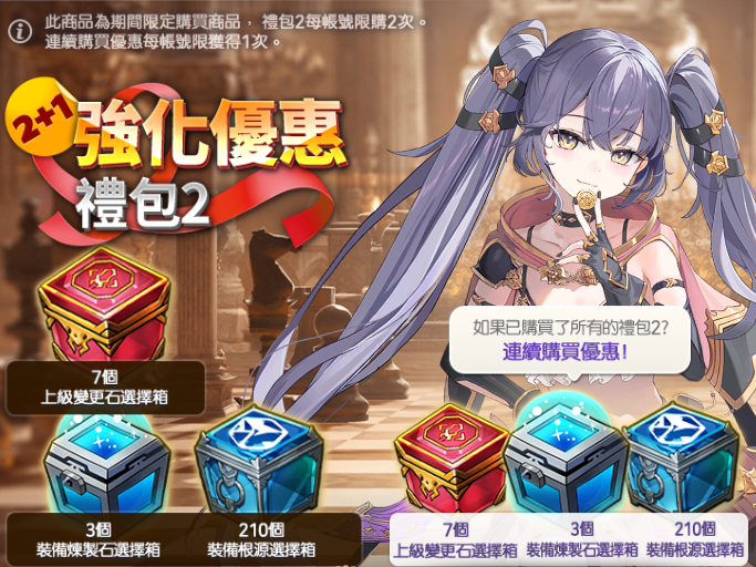 2+1強化優惠禮包2 | 上級變更石選擇箱 | 7 | 販售期間內可購買2次 | |