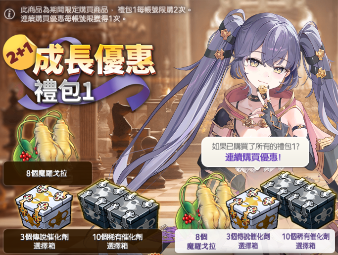 2+1成長優惠禮包1 | 魔羅戈拉 | 8 | 販售期間內可購買2次 | |
