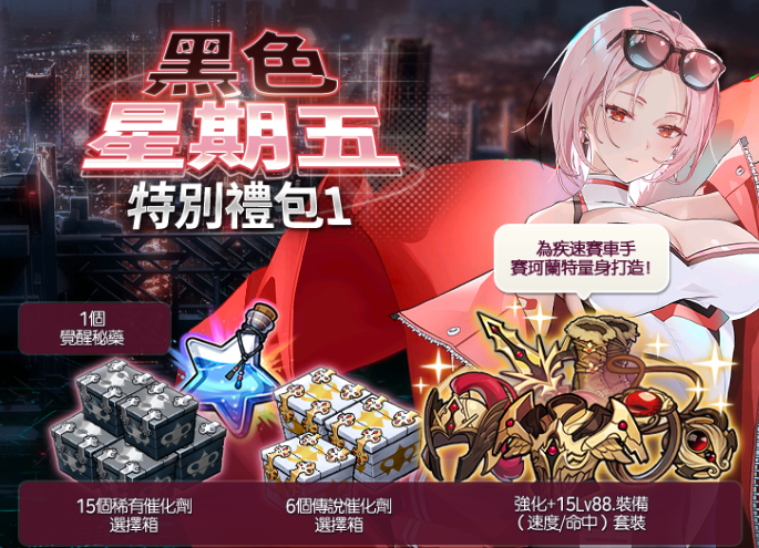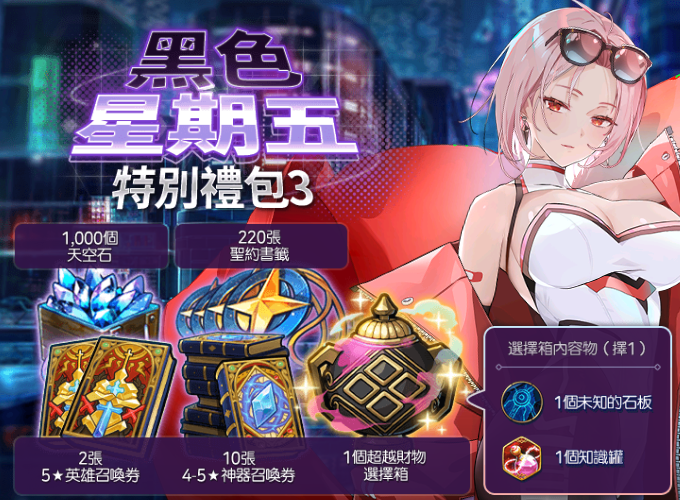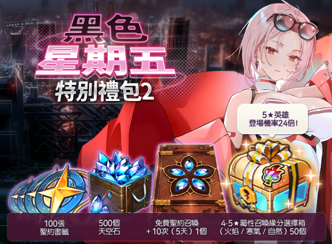 - 【黑色星期五特別禮包2】商品中所包含的「免費聖約召喚」商品,從購買禮包後起將會套用5天期間,且適用與原本的免費聖約召喚活動相同的規則。