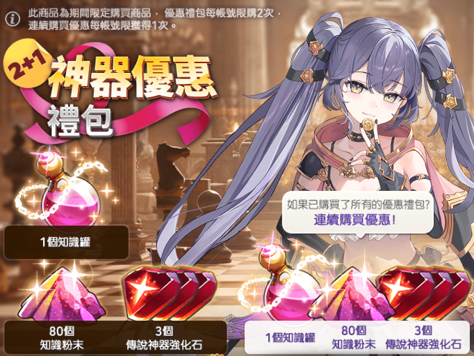 ※ 購買2次2+1禮包並領取「加成禮包」後,將無法申請退款。