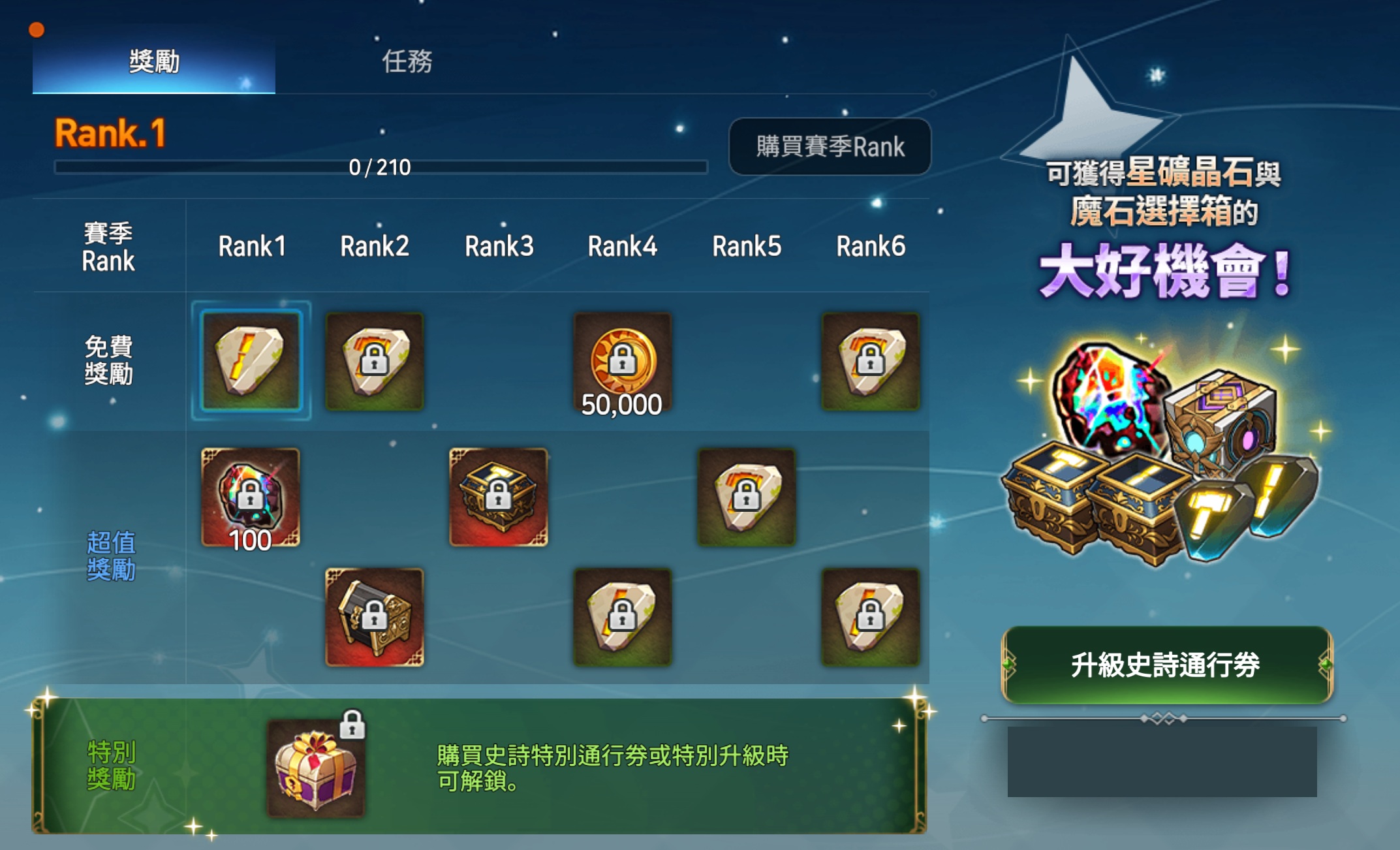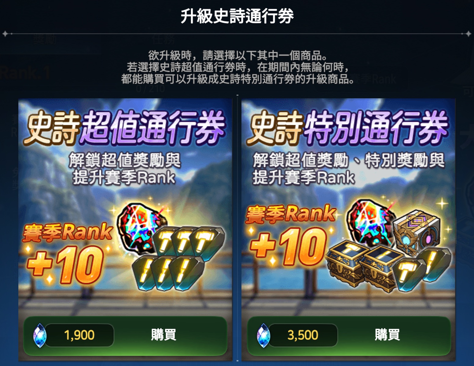 ※ 若先購買【史詩超值通行券】後,也可再消耗1600個天空石升級為【史詩特別通行券】。