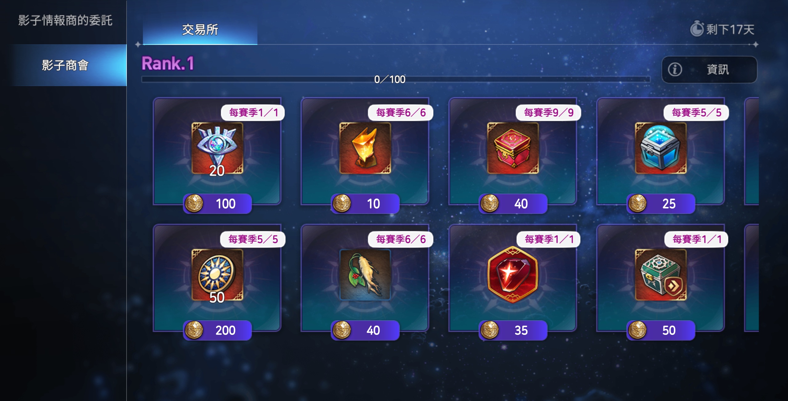 - 可透過進行賽季戰鬥副本,執行影子商會所提供的委託任務。