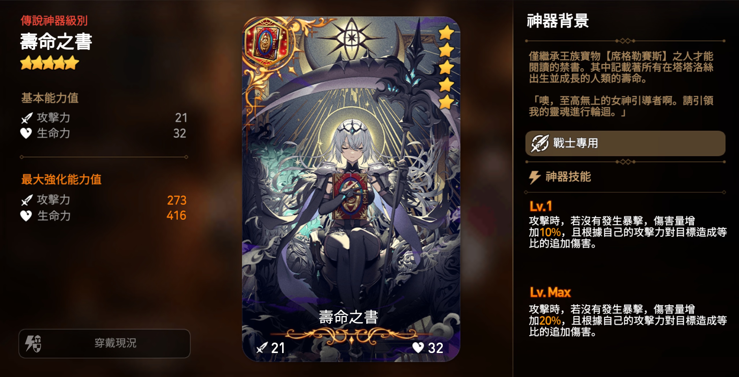 ■ 新增戰士專用5★限定神器【壽命之書】。
