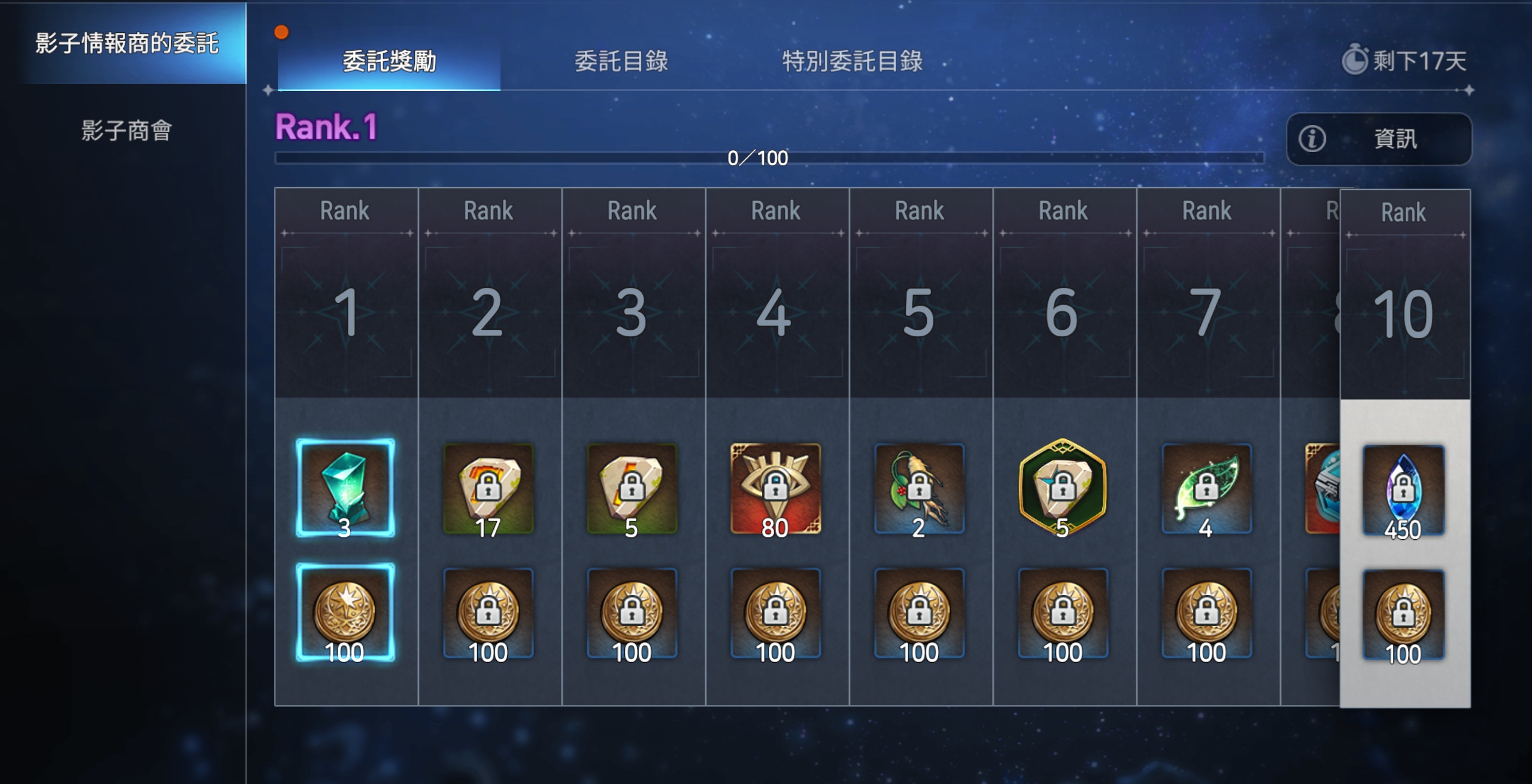 - 透過完成委託時獲得的【影子信物】,可獲得委託獎勵Rank經驗值,每達成各Rank時,即可獲得對應Rank的獎勵。