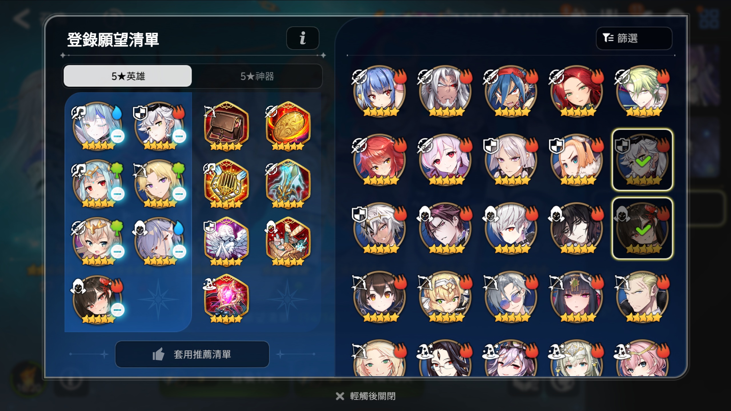 - 聖約召喚願望清單是在進行聖約召喚時,可用來指定想要的5★英雄與5★神器清單的功能。