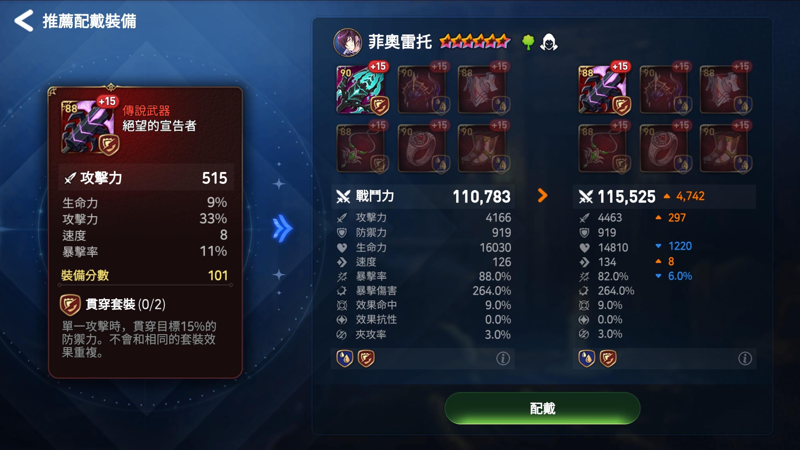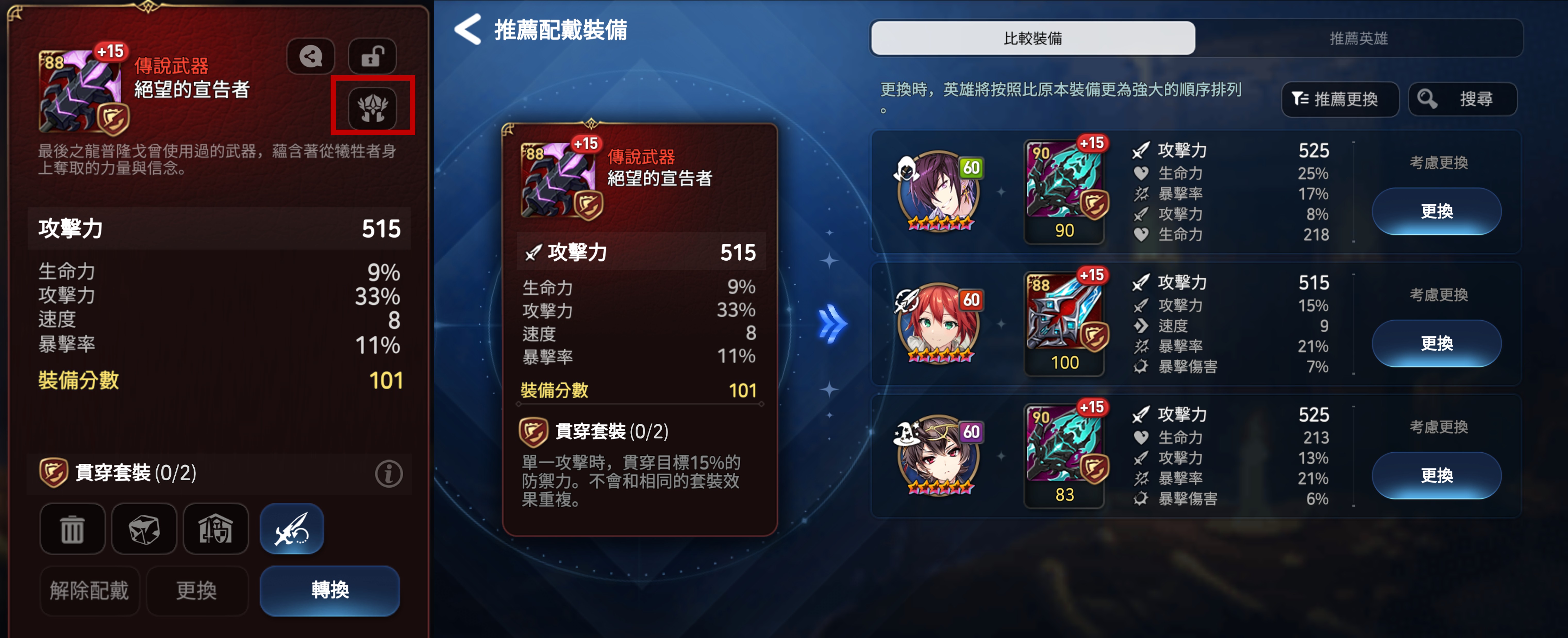 - 點擊更換按鈕後,可查看配戴該裝備時英雄能力值的變化。