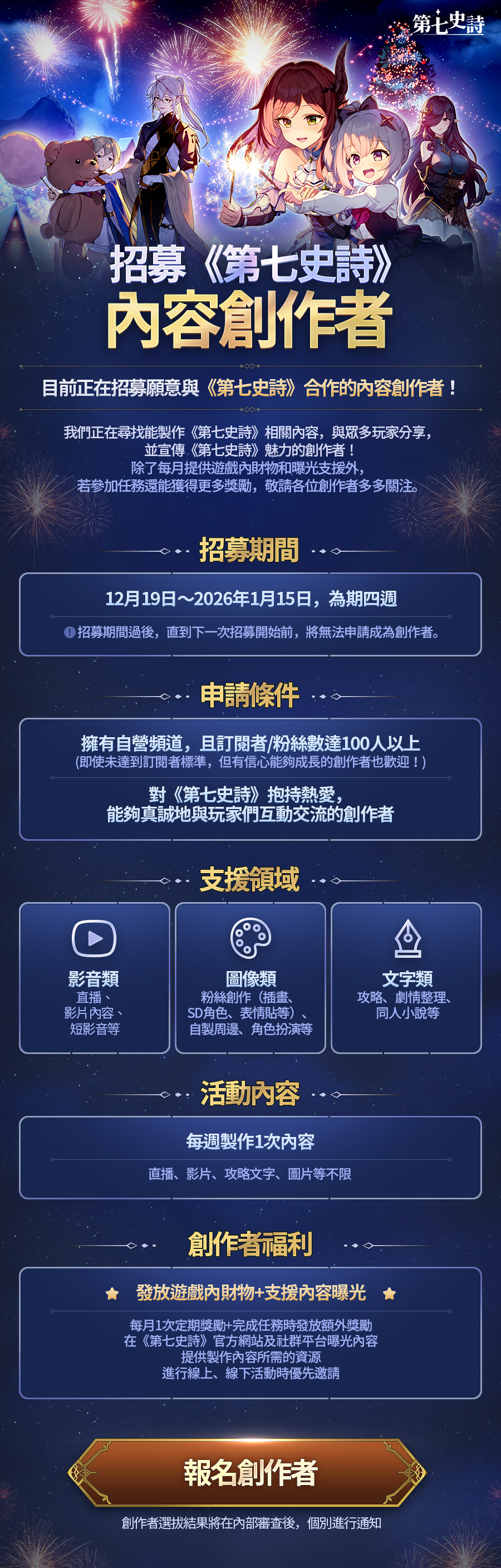- 創作者活動製作的內容可能會在《第七史詩》官網及社群媒體上曝光。