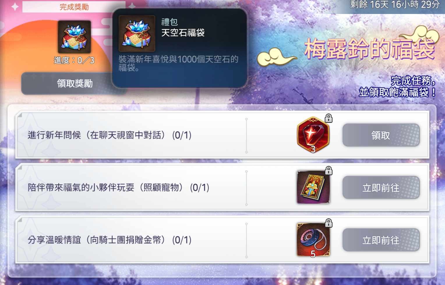 完成獎勵 | 天空石福袋(1,000個) | 1 |