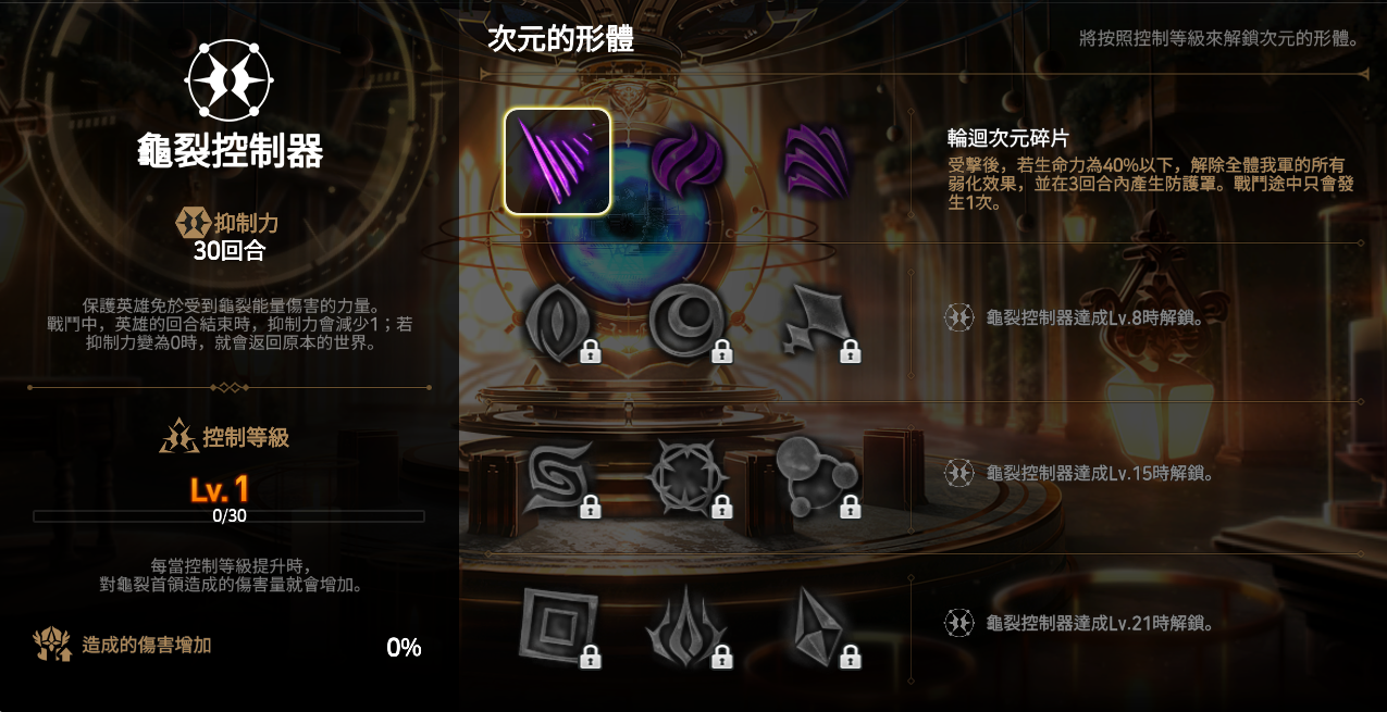 - 每當控制等級達到指定等級時,即可解鎖次元的形體效果。