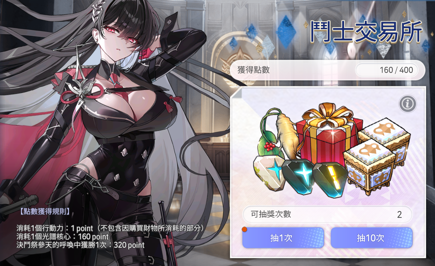 可依照下方「鬥士交易所」點數獲得規則,使用遊玩所獲得的點數進行抽獎,以開啟隨機箱。