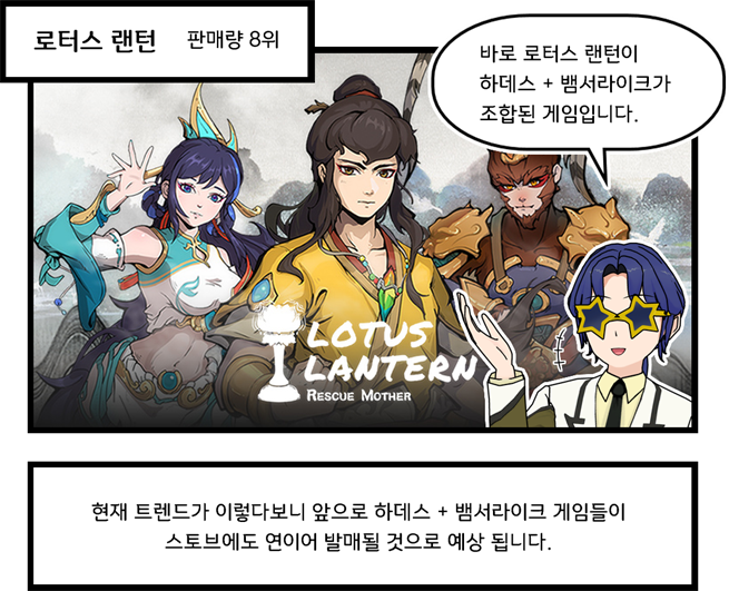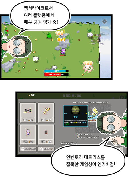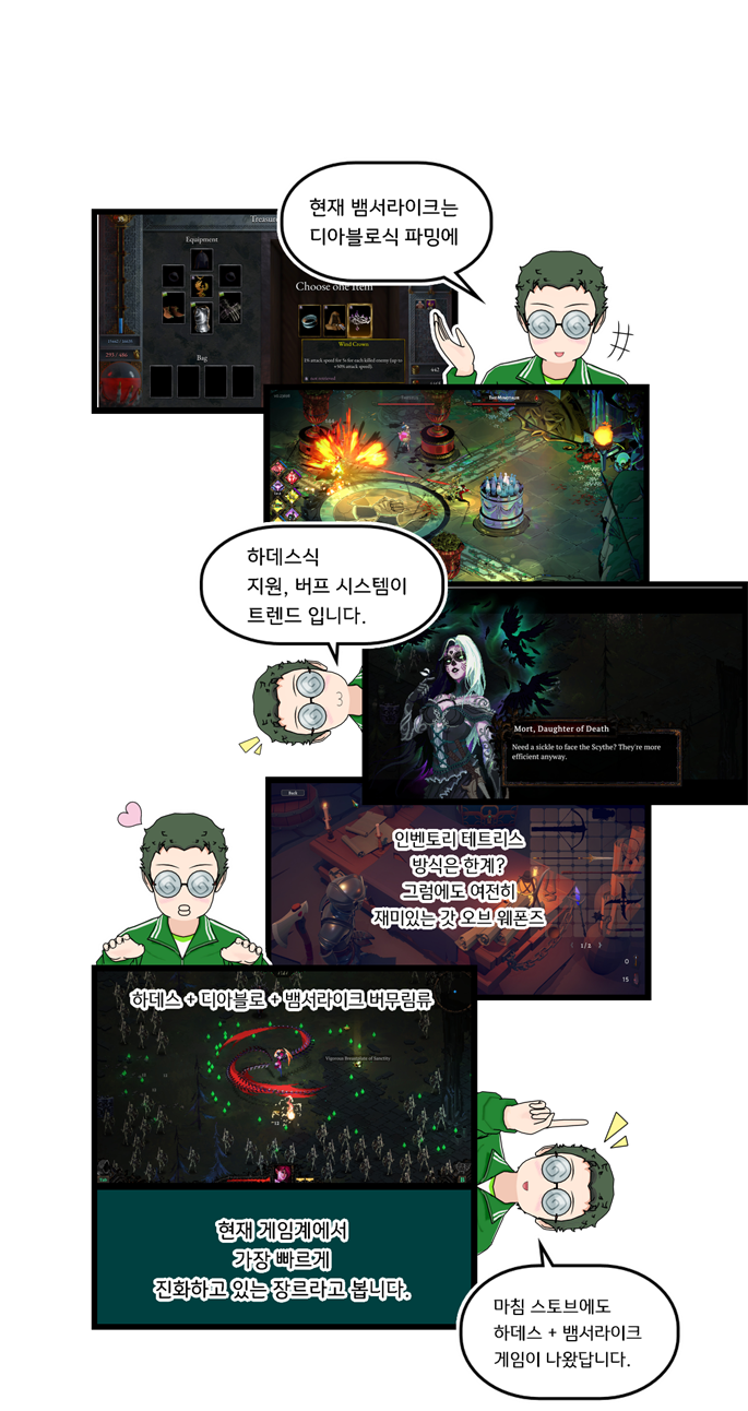 유사한 게임이 너무 많이 나오기도 했죠. 지금도 우후죽순 나오고 있고 좀 있으면 롤에서도 뱀서라이크 모드가 생긴다네요.