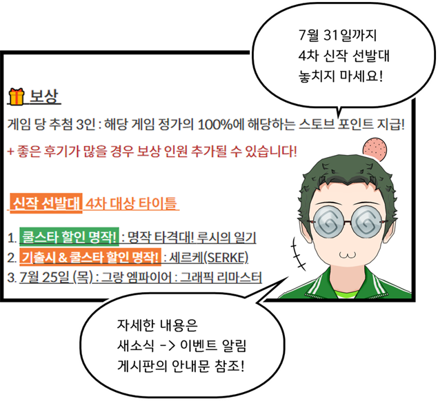 * 스토브 웹페이지와 런쳐 상단의 이벤트 메뉴에서 쉽게 확인 가능합니다.