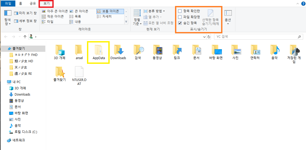 사세니아우선 사용자 폴더에서 숨긴 항목 보기 체크하시고