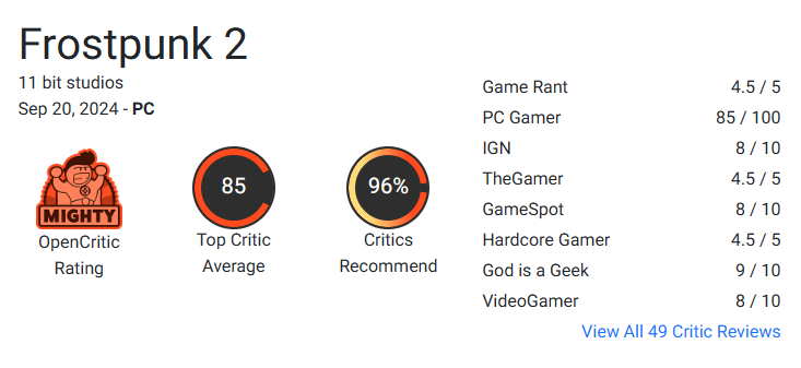 프로스트펑크 2편이 메타크리틱과 오픈크리틱에서 모두 85점을 기록하며 “전작과 동일(85,86점)”한 재미를 보여줌을 증명했습니다.