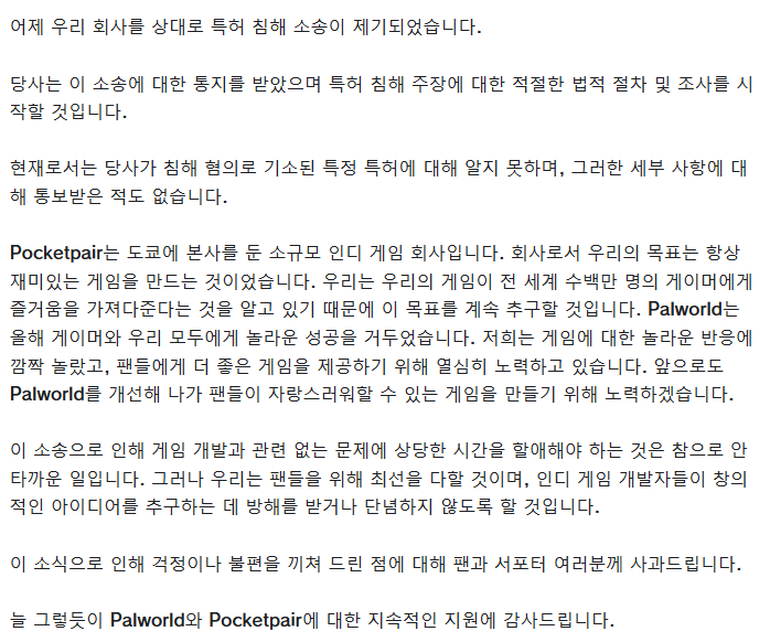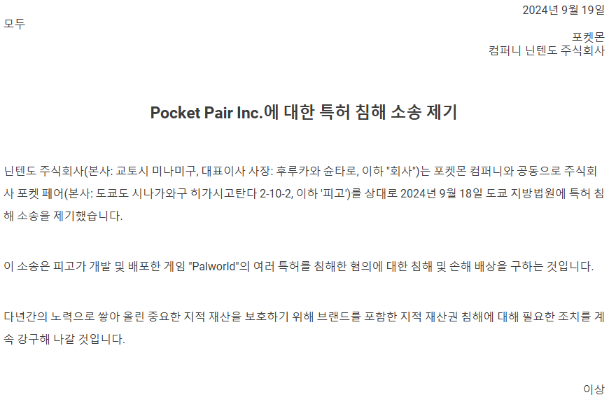 포켓 페어 측의 소송에 대한 공식 성명