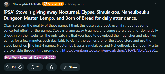 최근에 무료게임 레딧에서, '스토브의 출책 > 무료 게임'과 '플레이크 > 게임 교환'의 정보도 올라오던데, 이걸로 유저들이 조금 더 유입됬을려나요? ㅎㅎㅎ