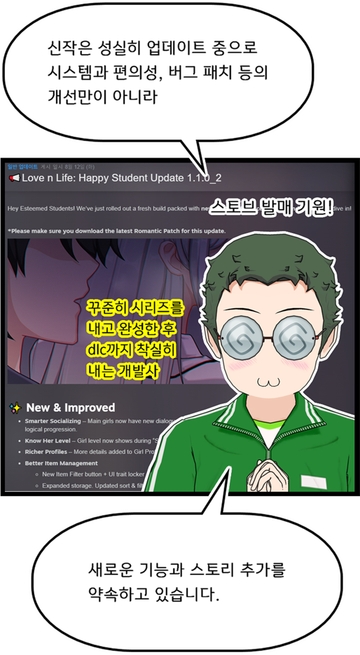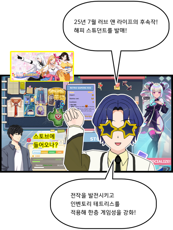 러브 앤 라이프, 해피 스튜던트는 전반적으로 일진일퇴한 느낌이었습니다. 발전한 면은 많아졌는데, 게임성에서 갸우뚱하는 부분이 좀 있었네요. 데모에서는 테트리스 (인벤토리 관리 - 오토 배틀) 부분을 상당히 기대하게 보여줬는데, 실제 게임에서는 해당 전투의 분량도 역할도 부족하고, 해당 파트의 완성도가 조금 많이 떨어졌네요 ㅠㅠ