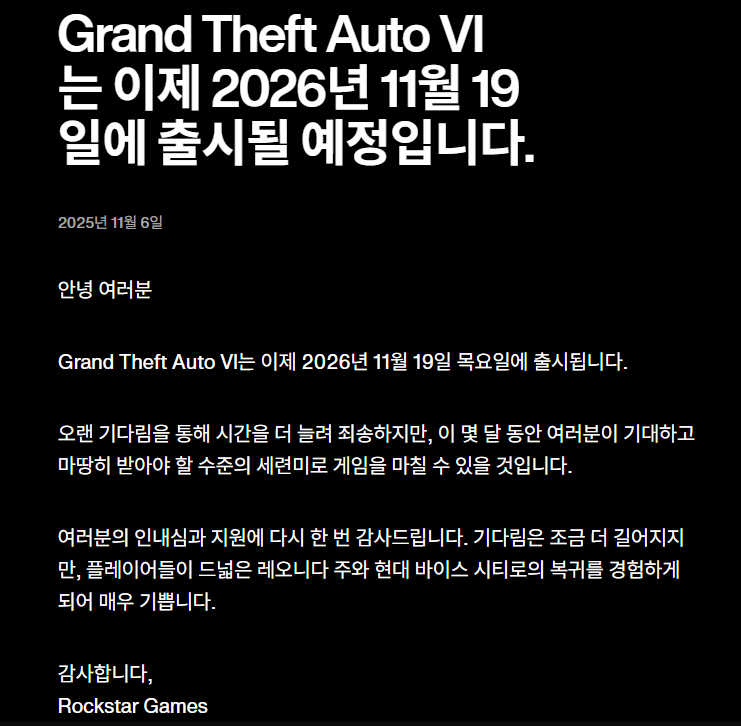 과연, 내년 연말에는 정말 GTA 6를 만날 수 있을까요?