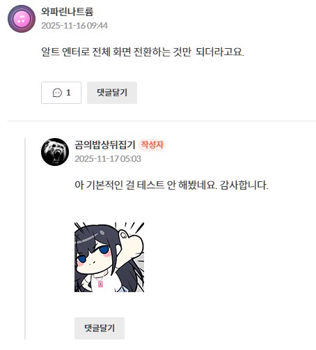 알트 엔터로 전체 화면 전환하는 것만 되더라고요.
