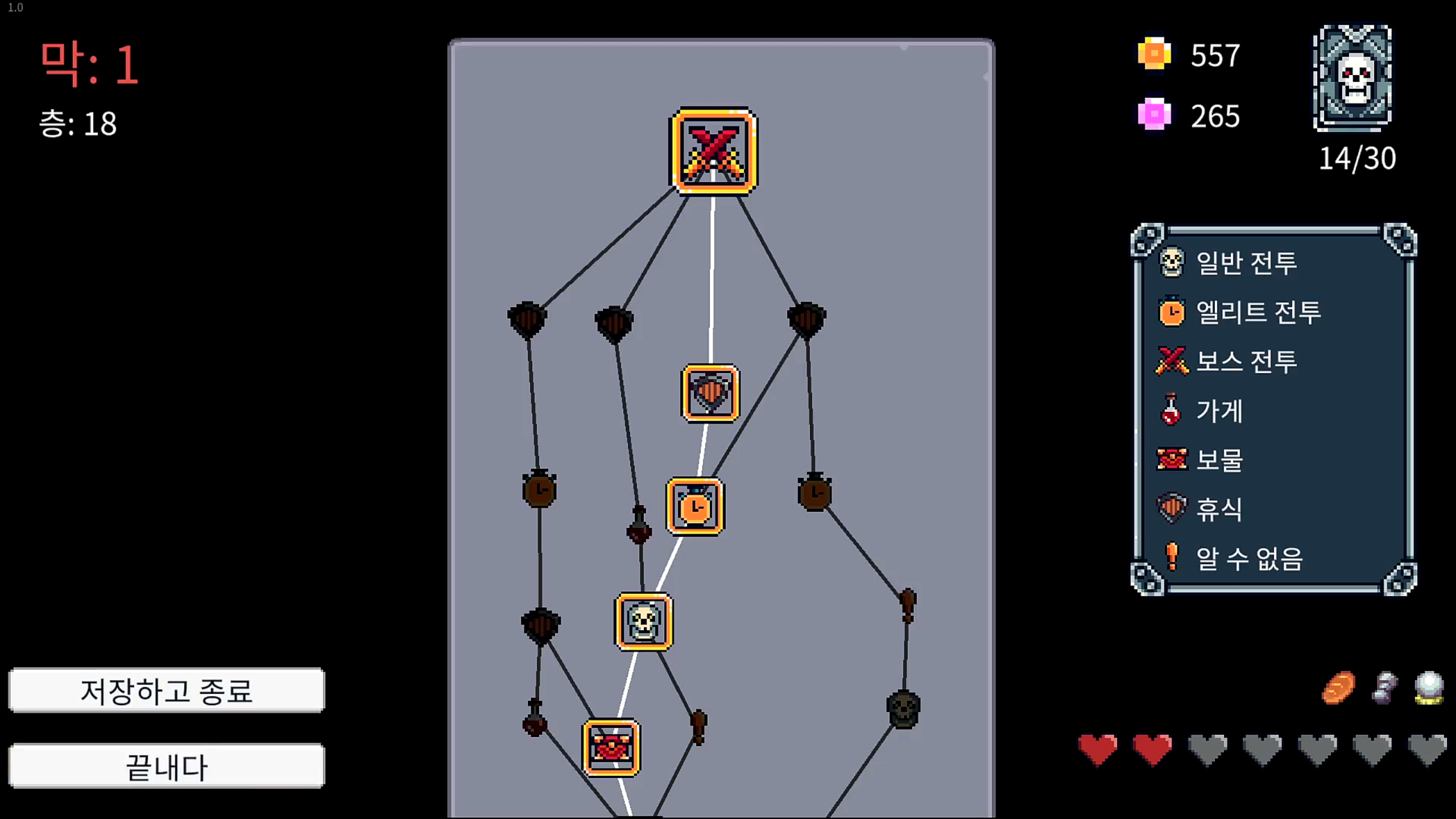 로그라이크 모드는 초반에 재미있게 플레이했으나 1막 보스전을 클리어해도 2막으로 넘어가지지 않는 버그로 2막 이상을 플레이해보지 못했어요