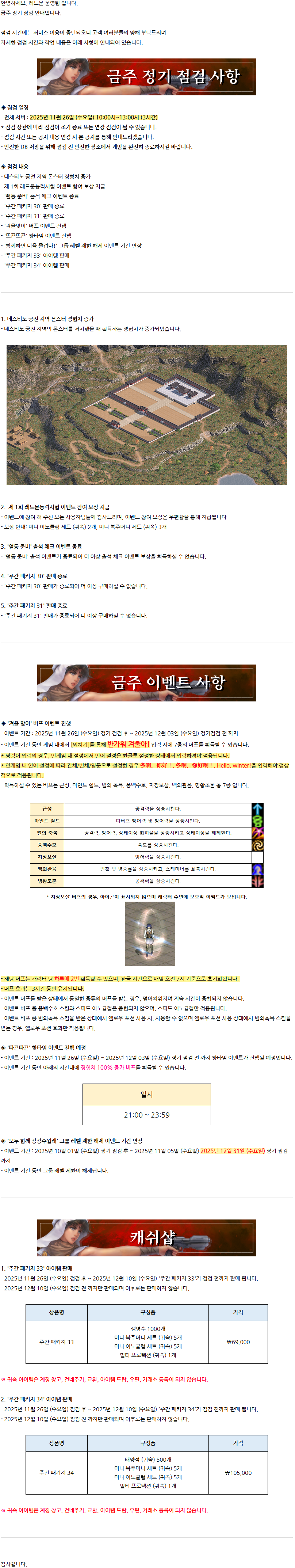 Redmoon's post List GM GM레드문 View MY HOME View Posts 작성 시간 27/11/2025 +1 '지상군 사령관을 잡아라!' 보스 챌린지 이벤트 개최 (12/1 내용 추가) 27/11/2025 27/11/2025 10:27 AM GM GM레드문 View MY HOME View Posts 작성 시간 26/11/2025 [레드문 온라인] 11월 26일 (수) 정기 점검 완료 안내 드립니다. 26/11/2025 26/11/2025 02:25 AM GM GM레드문 View MY HOME View Posts 작성 시간 25/11/2025 [레드문 온라인] 11월 26일 (수) 정기 점검 안내 드립니다. 25/11/2025 25/11/2025 09:30 AM GM GM레드문 View MY HOME View Posts 작성 시간 19/11/2025 [레드문 온라인] 11월 19일 (수) 정기 점검 완료 안내 드립니다. 19/11/2025 19/11/2025 03:10 AM GM GM레드문 View MY HOME View Posts 작성 시간 18/11/2025 GM과 함께 즐겨보자! O,X 퀴즈 이벤트 18/11/2025 18/11/2025 10:05 AM