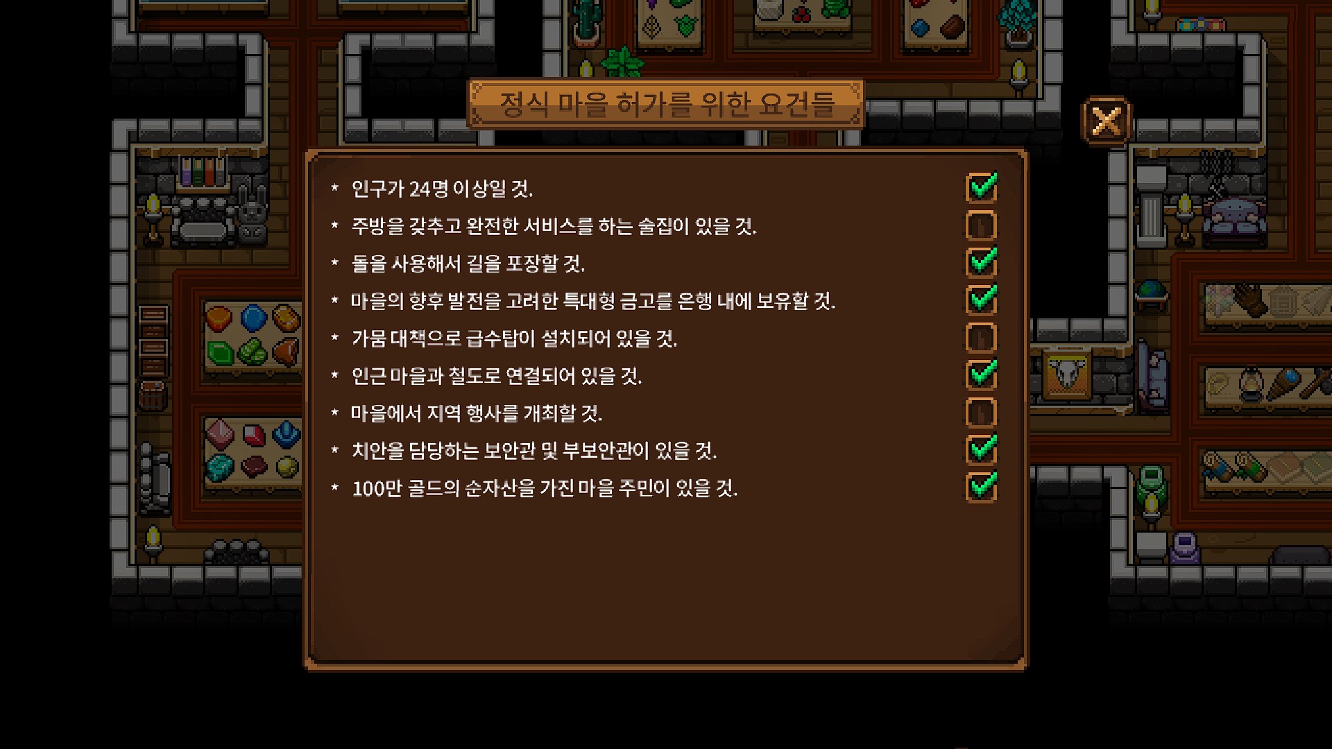 추가 : 젭의 이야기를 완료하고 나서 며칠 뒤 마을 허가 조건을 확인해보니 100만 골드의 순 자산 조건이 완료된 상태로 표시되었습니다.