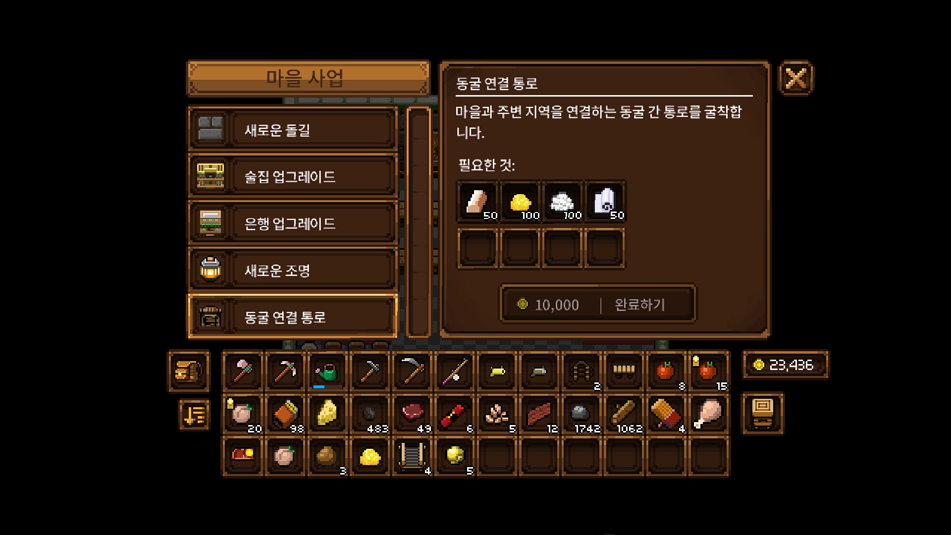<그리고 동굴 연결 통로라는 새로운 마을 사업이 열리죠>