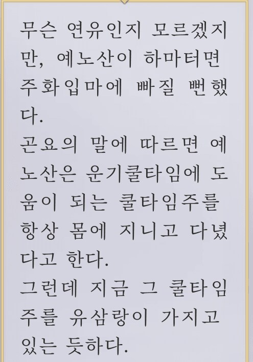쿨타임도 조만간 한자로 나오지 않을까요 ㅋㅋㅋㅋ 오아시스는 일주일에 이틀 정도는 현실을 살아라 같은 느낌이었는데 강제 섭종이라고 느낄 수도 있겠군요. 견문을 더 넓히도록 노력해봐야겠네요. 이번주도 너무 좋고 많은 내용 감사합니다.