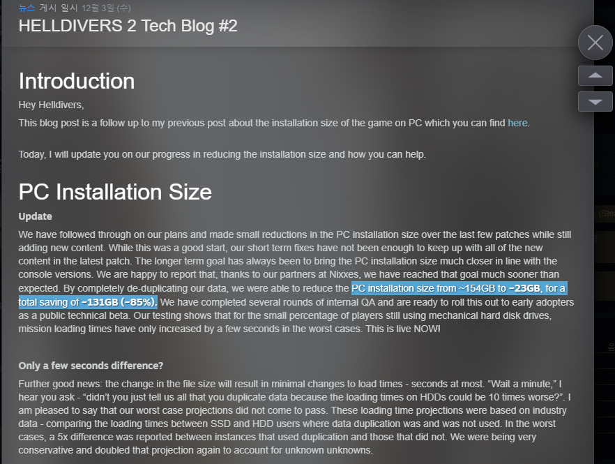 헬다이버즈 2 용량이 100기가 이상 낮아졌다니 ㄷㄷ