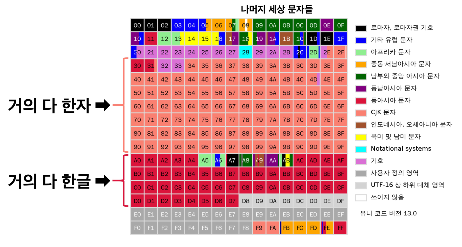한국어도 한자보다 훨씬 적긴 해도 11,172자의 조합형 글자를 커버해야 하는 점에서 ‘복잡한 문자권’이지만,