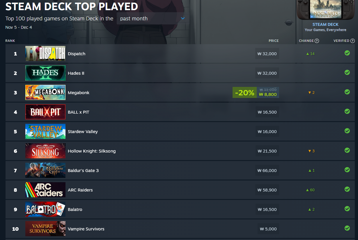 1편의 전설을 그대로 이어받아, 하데스 2도 2위에 알박기를 시작했군요! 1편도 그렇게 스팀덱에서 즐길 수 있는 최고의 게임으로 꼽혔는데.
