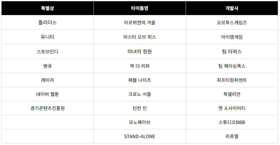 우선 비버롹스의 스폰서마다 주는 특별상이 있었으며, 총 9개의 게임이 수상했습니다.