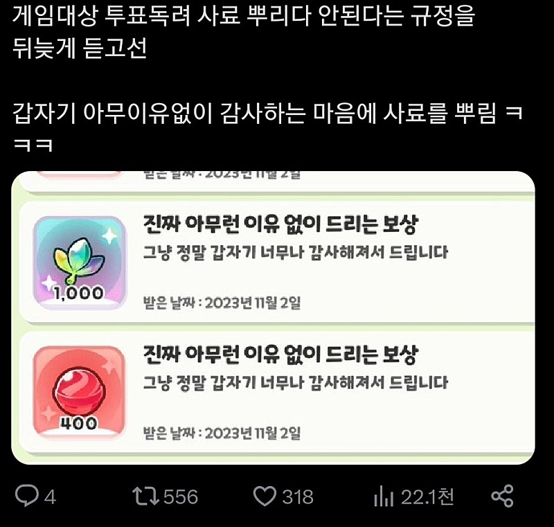 이들 게임은 이벤트 보상, 이른바 ‘사료’가 존재하기 때문에 보상을 노린 팬들의 대규모 몰표가 개입된다는 우려가 꾸준히 제기되어 왔죠.