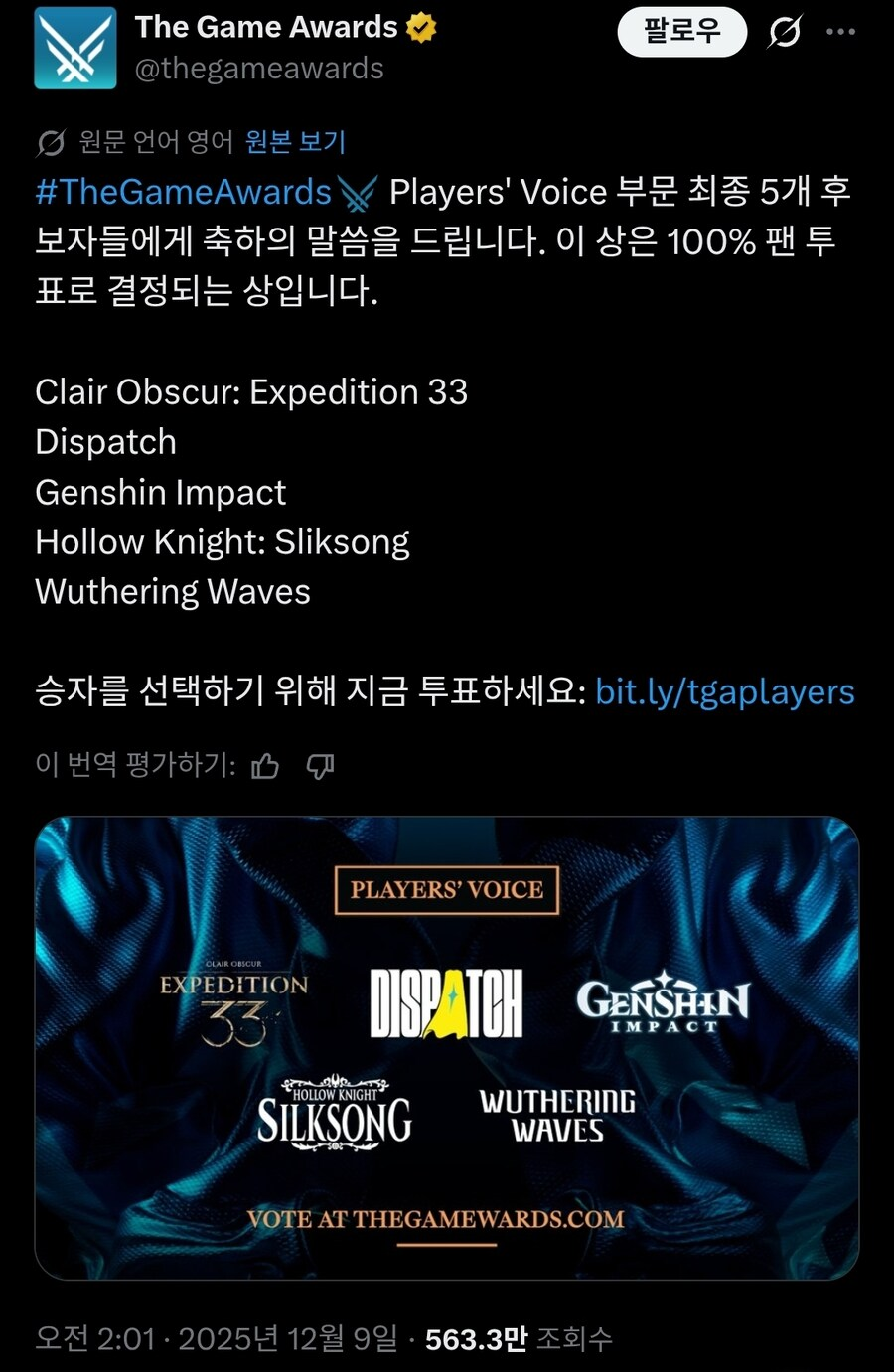 이번 후보는 33원정대, 디스패치, 원신, 할로우 나이츠 실크송, 명조 다섯 작품.
