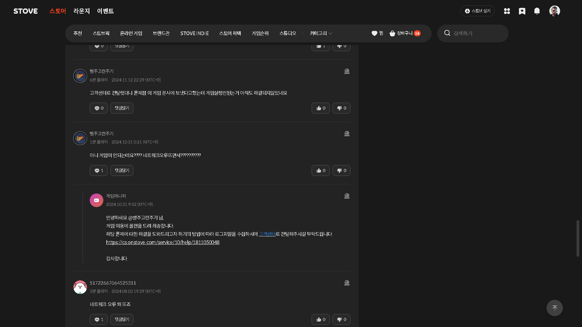 글상세😁 Free Talk [FreeTalk] <황천 악몽의 아일랜드> 가지고 계신분들~~ [4] S1130600821183038 16/12/2025 06:32 PM 17/12/2025 03:32 AM (+09:00) view count 57 View MY HOME View Posts Report Share 지금 실행이 되는지 확인 가능하십니까~~~~~ 전에 이 게임 사고 싶어서 후기 보니깐.. 네트워크 오류 어쩌고 하면서 실행 자체가 안된다는 글들이 꽤 있어서 그냥 포기 했었는데...그전보다 가격이 너무 착하게 내려와 있네요~ 1년 넘게 지났는데 설마 아직도 실행이 되지 않으면서 판매를 하지는 않을것 같기는한데...만약 아직도 실행이 되지 않는데 판매를 하고 있다면 어처구니가 없겠죠~혹시나 가지고 계신분들중에 실행 유무만 알려주신다면 정말로 감사할것 같습니다~~ Reply 4 alarm Notification has been disabled. Newest Newest By registration By recommendation To enter a comment Log In Please Report Sitou 17/12/2025 12:20 AM 17/12/2025 09:20 AM (-NaN:NaN) View MY HOME View Posts Report 이런 게임도 잇엇군요 혼돈악 16/12/2025 08:11 PM 17/12/2025 05:11 AM (+09:00) View MY HOME View Posts Report 어째 자알 돌아가는거 같네요? S1130600821183038 Written by 17/12/2025 07:05 AM 17/12/2025 04:05 PM (+09:00) View MY HOME View Posts Report Confirm Cancel Confirm
